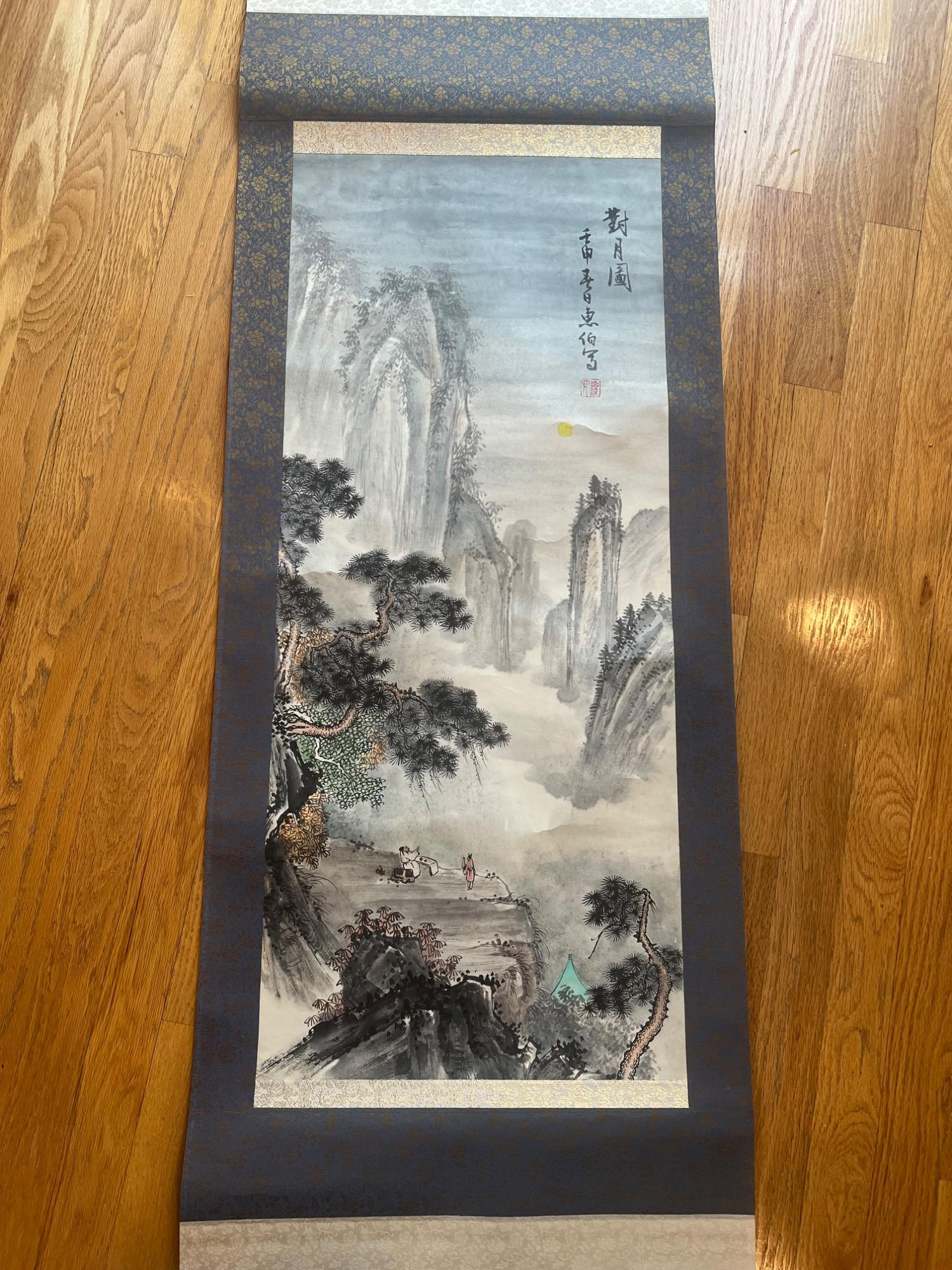 Scroll has Asian scene block printed on heavy art paper. Gilded design at top and bottom and in detailing framing the scene. Hangs on wall. Wood dowels are solid wood and have weight. Comes in its original storage box. Signed by artist. GT