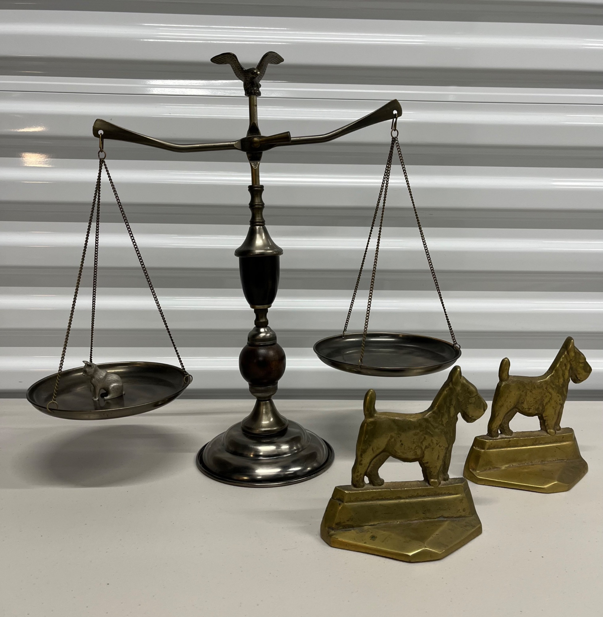 Scales of Justice w/ Pewter Cat and Terrier Brass Bookends