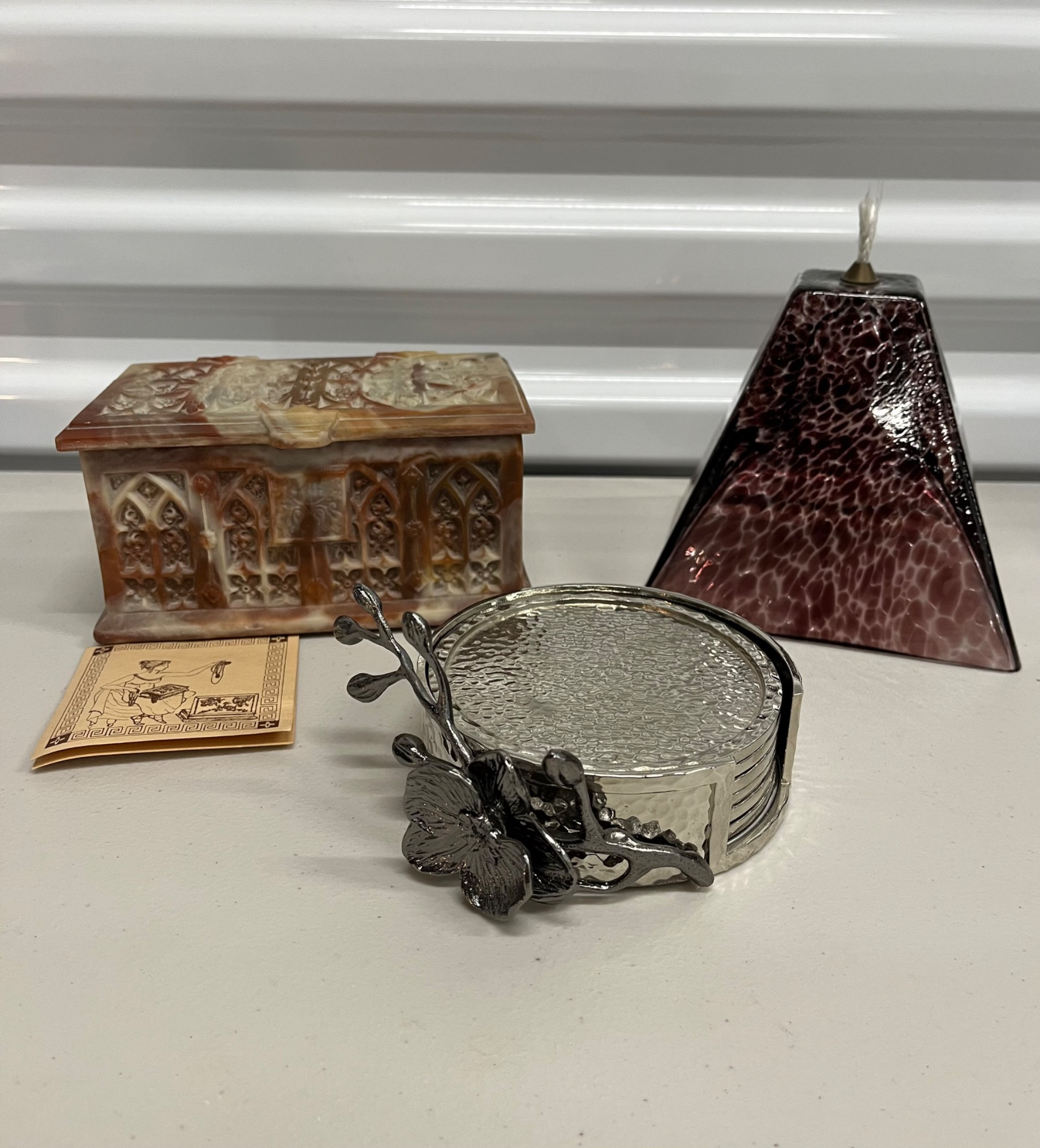 Incolay Stone Box, Artisan Glass Oil Lamp & Michael Aram Coasters