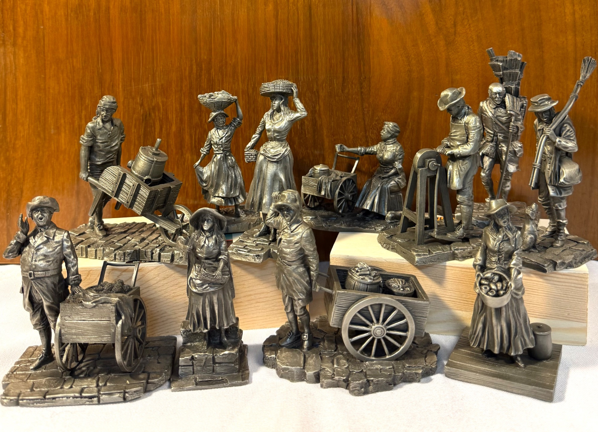 Row Hinote Pewter Chimney Sweep, The Pineapple Man, Broom Salesman, Charcoal Peddler, Hot Pear Lady, The Scissor Grinder, The Strawberry Girl, The Match Girl, The Pepper Pot Lady, Buttermilk Man, and Hot Corn Girl. Height from 4’ - 3 1/2 inches/ Bases Vary from 1 1/2 - 3 inches