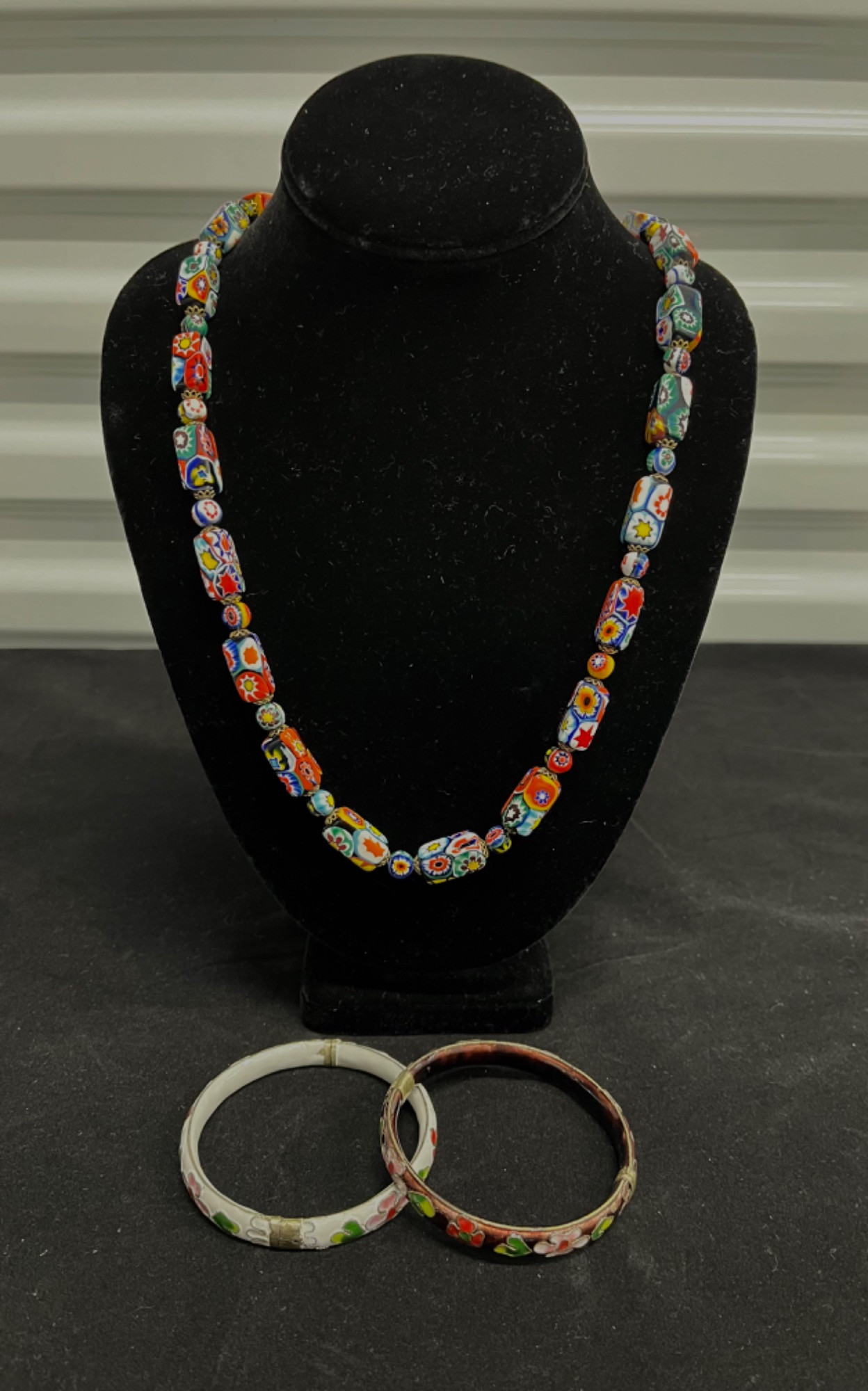 Murano Millefiori Bead Necklace & Vtg. Cloisonne Bangle Bracelets