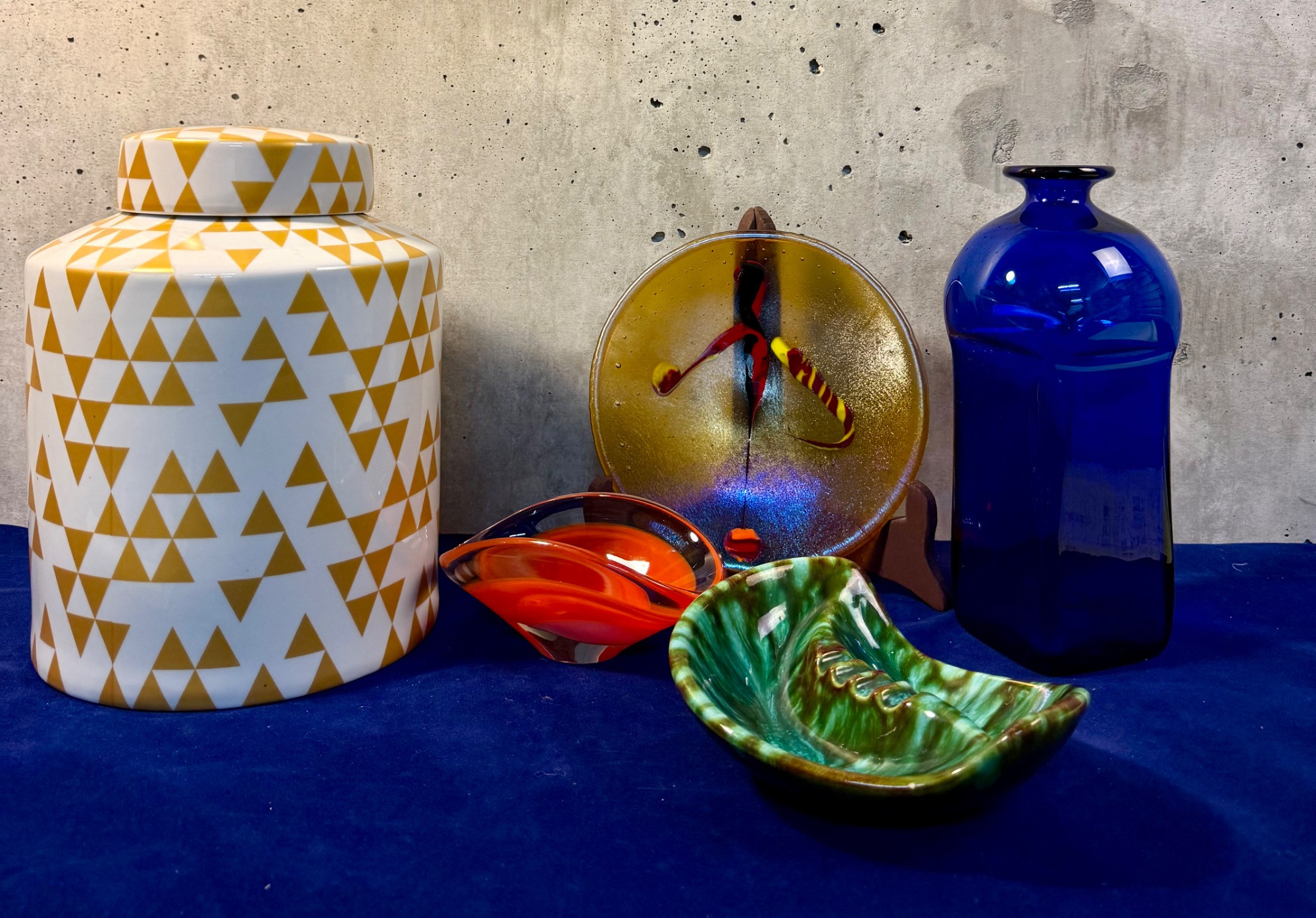Blown Glass Lot & more Cobalt Plus Norway Richard Duborgh blown glass bottle (signed) - 3 x 2 x 9 1/2 1960’s Swedish Flygsfors Coqullie Blown Glass Plate Art 5 3/4 x 3 1/4 x 2 3/4 Teal - Green Drip Glaze Ashtray 6 1/2x 5 1/2 x 2 1/2