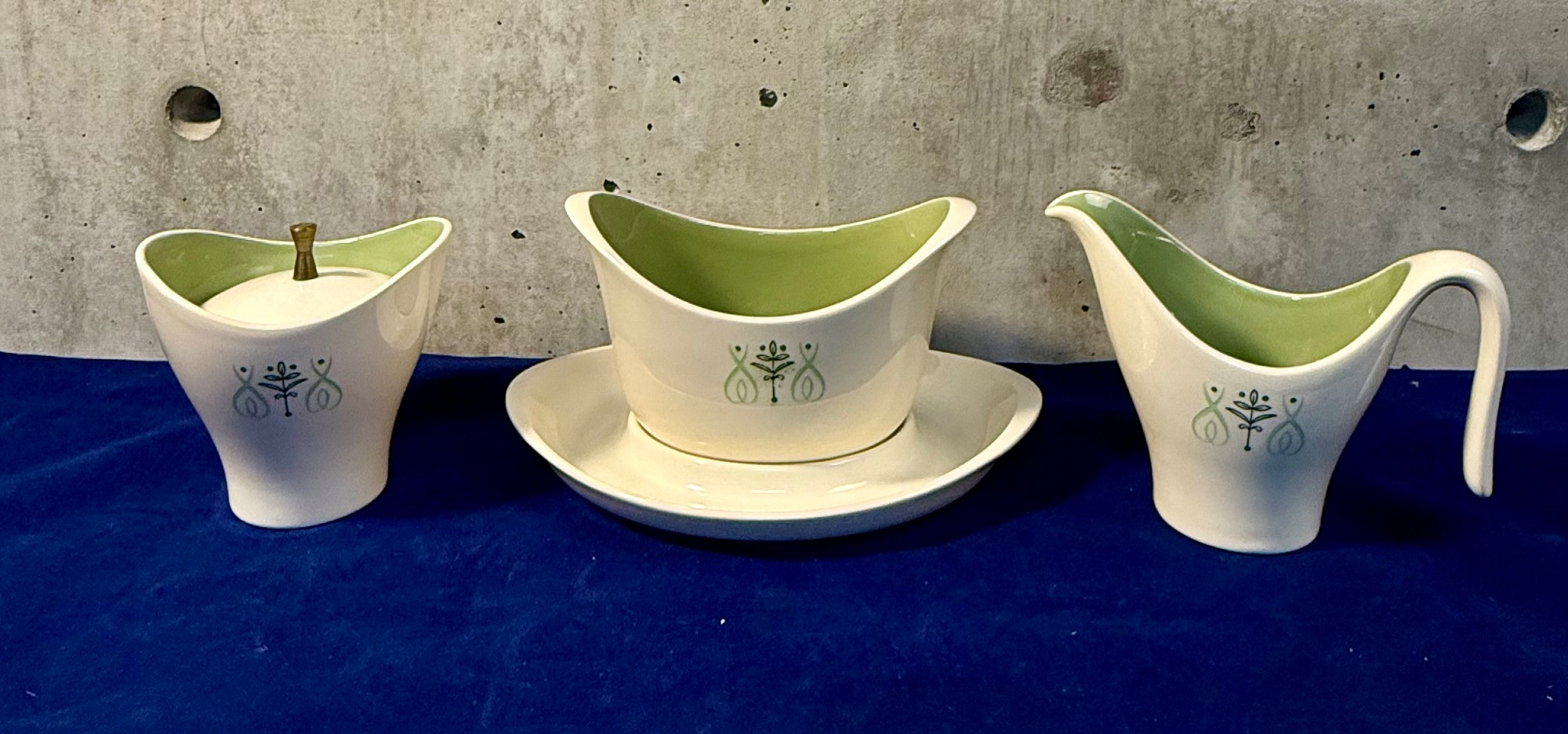 60’s Harmony House Del Ray Set sugar bowl - 4 3/4 x 4 x 4 Gary base plate - 8 x 6 1/2 x 1/2 gravy bowl - 6 3/8 x 4 1/4 x 4 gravy pouring cup - 6 x 3 1/4 x 4 3/8 (Ceramic)