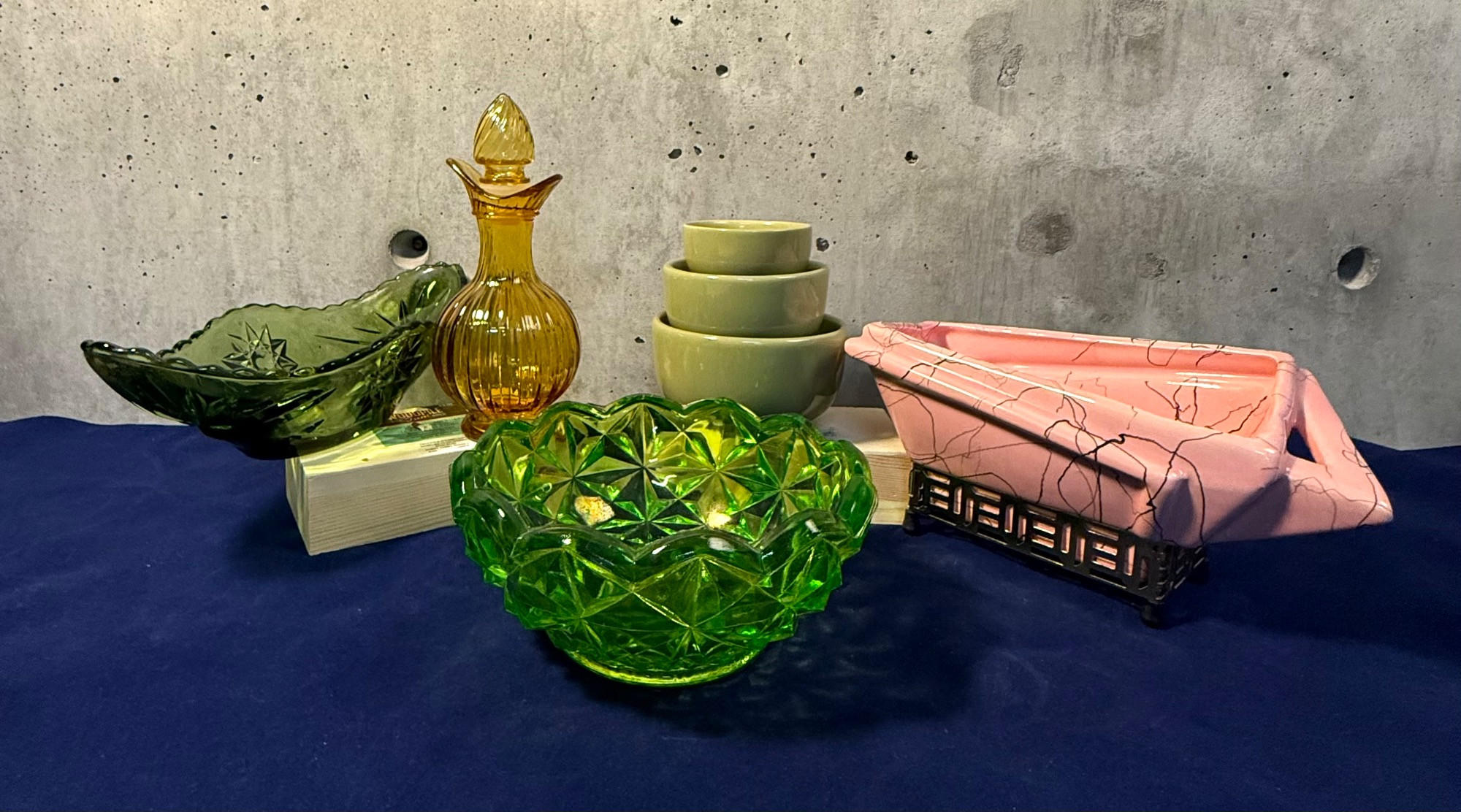 Glass Extravaganza king Crown Emerald Indiana Glass Bowl - 6 1/2 x 3 1/2 x 3 Skewd Art Deco Planter w/stand - 10 x 4 x 4 1/4 Nesting Candle Set Vintage Candy Bowl - 9 3/8x 4 x 3