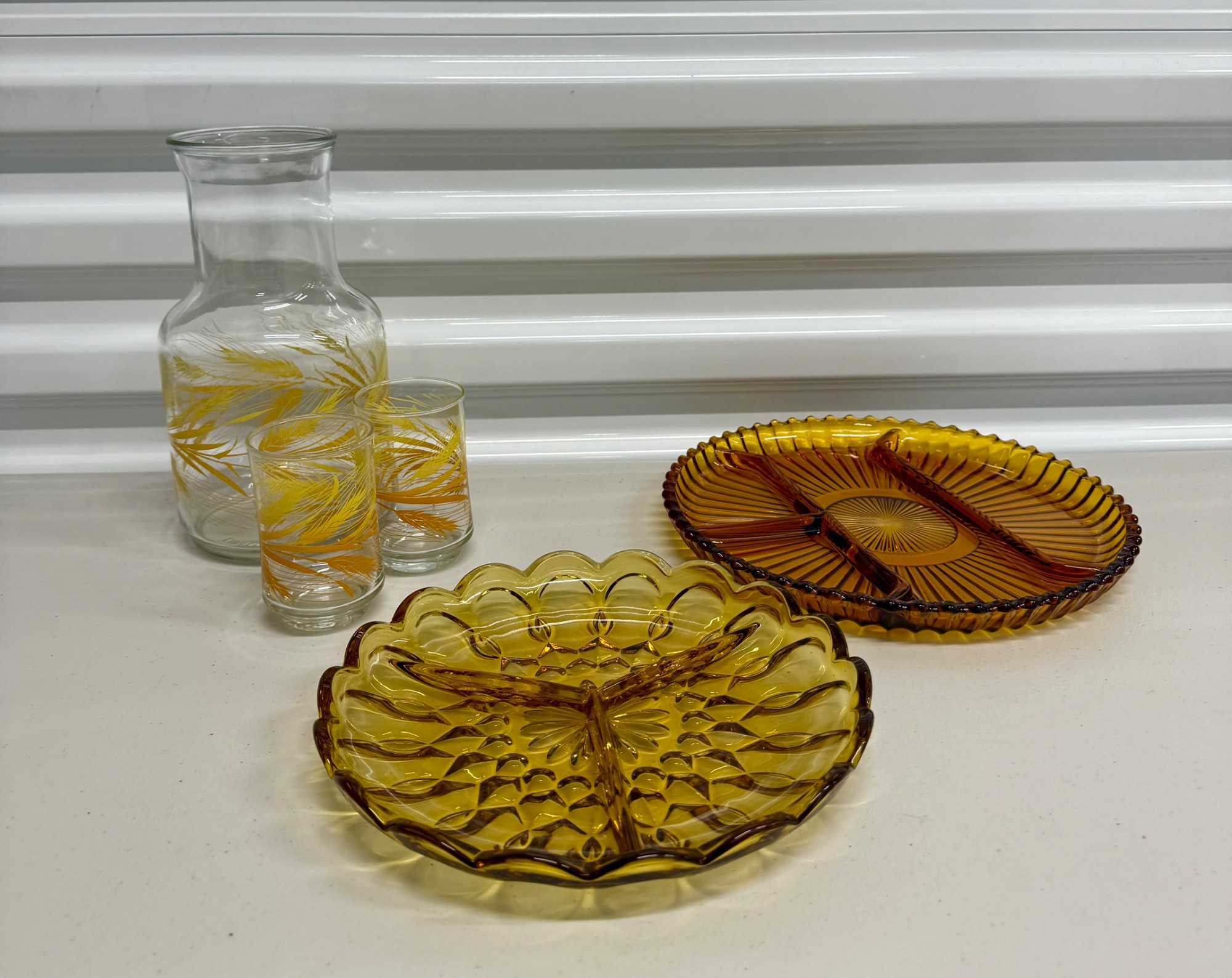 Amber Glass & Libbey Juice Trio Amber Glass Scalloped Divided Dish - Dia: 8 5/8" x 1 1/4"H Amber Glass Divided Relish Plate - Dia: 10" x 1"H