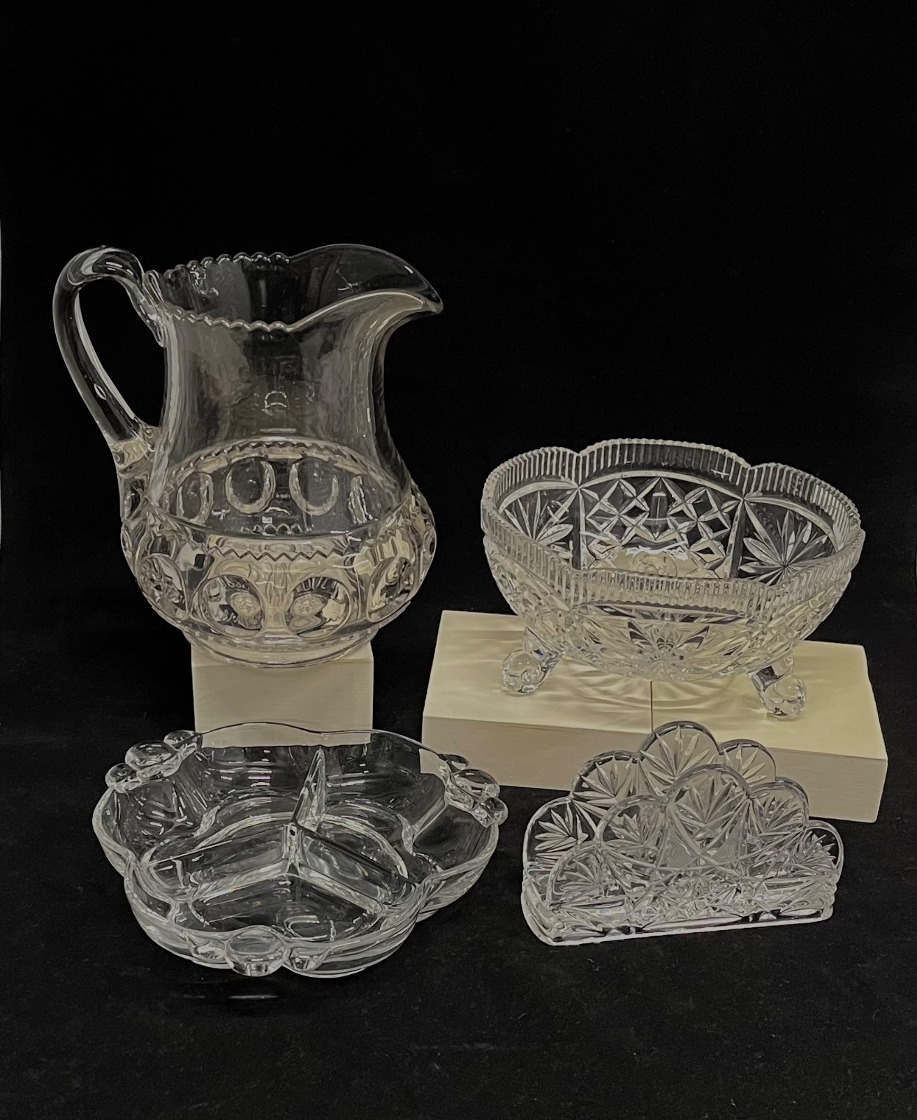 Cut Glass and Crystal Entertaining Tiffin Indiana King Crown Thumbprint Crystal Pitcher: 7 3/4"L x 6 1/2"W x 8"H Cut Crystal Napkin Holder - 5 7/8"L x 1 3/4"W x 3 3/4"H Footed Cut Crystal Bowl - Dia: 8" x 4"H