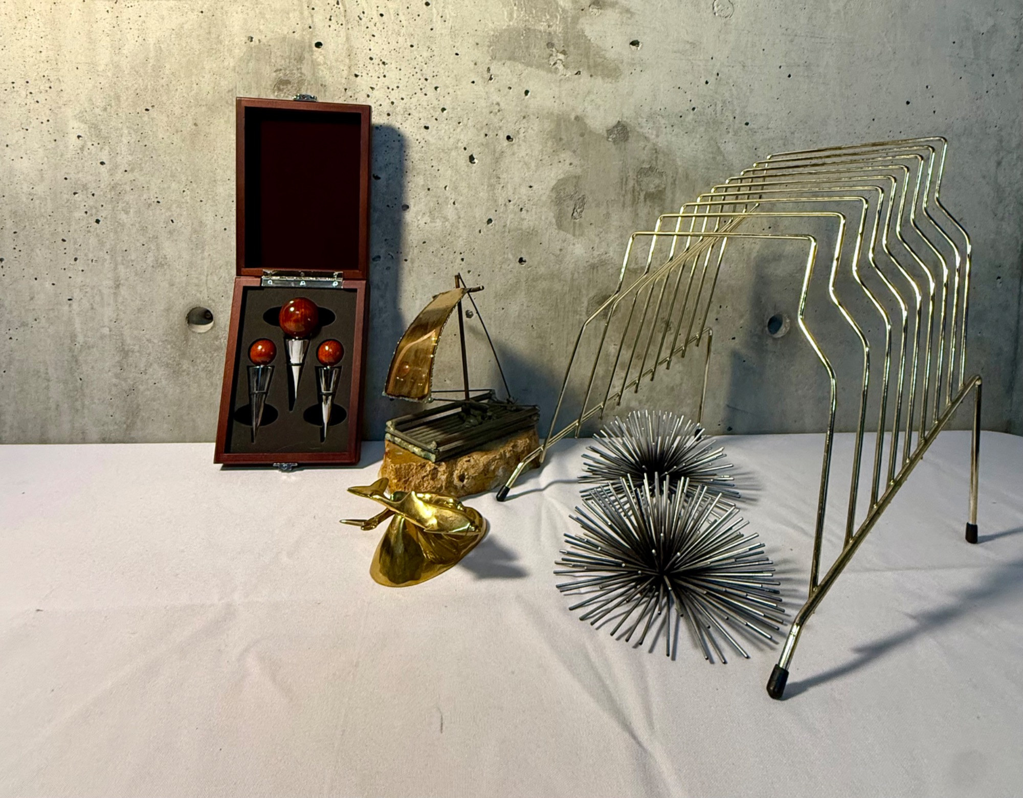 Mid Century Mixture Starburst Wall Decor Bass Sculpture on Marble (signed) Miniature Brass Dolphins Sculpture Rosewood Wine Bottle w/ Box