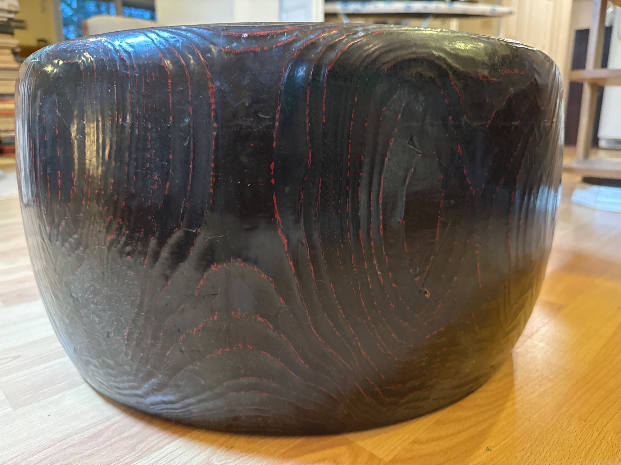 Vintage Japanese sculptured wood hibachi brazier with liner. Deep copper liner in great condition. Metal brazier with sculptured wood look. Black with red undertones. In great condition. What is a Japanese Brazier- The hibachi (Japanese: fire bowl) is a traditional Japanese heating device. It is a brazier which is a round, cylindrical, or box-shaped, open-topped container, made from or lined with a heat proof material and designed to hold burning charcoal. It is believed hibachi date back to the Heian period.