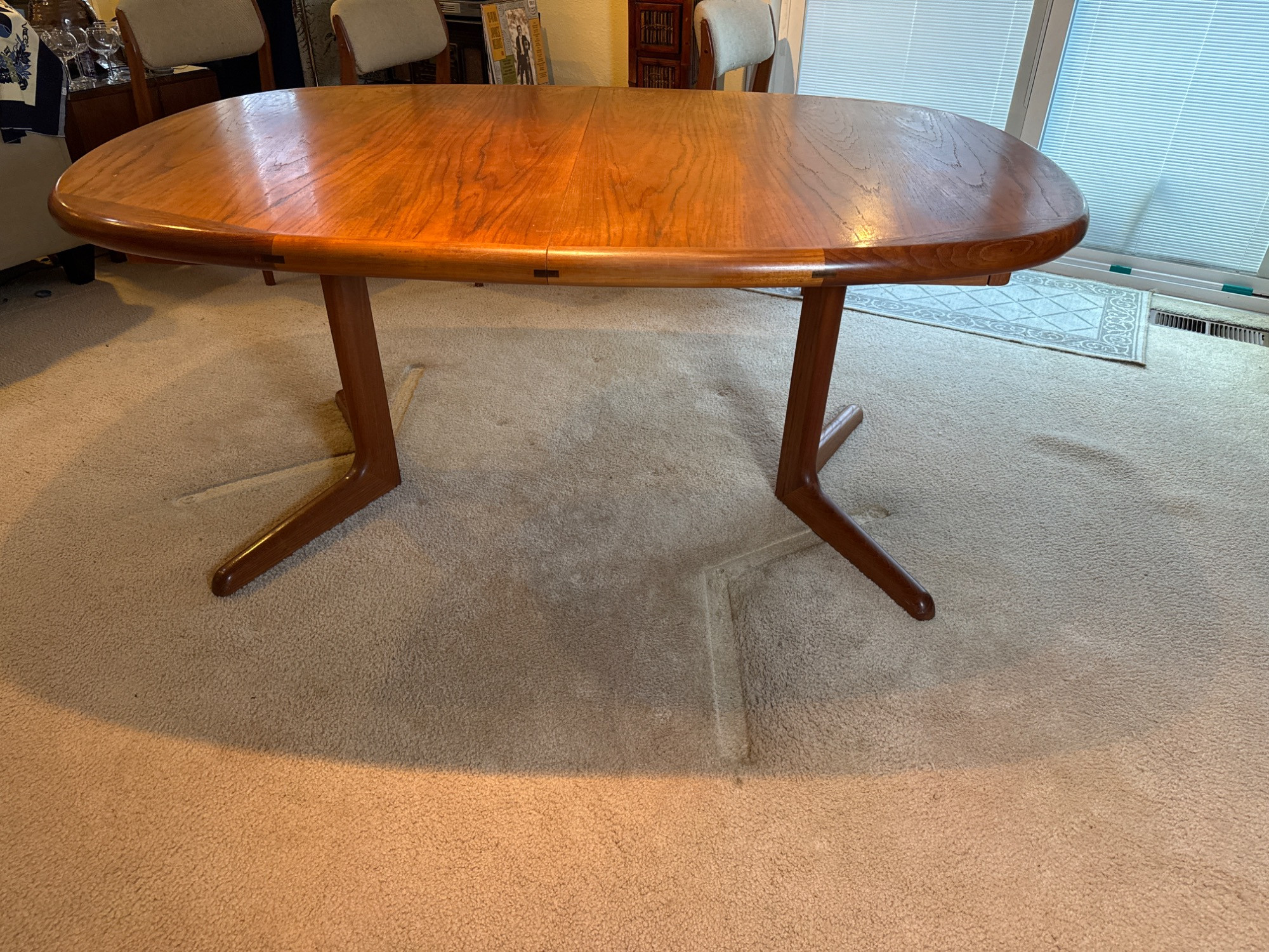 This Teak Dining Table designed by Benny Linden is simply timeless - perfect for a Mid Century / Danish Modern styled interior or a Mixed Modern styled interior. The table top and base is made of solid teak (yes, SOLID!) and not veneer - so you know it is well built and can withstand the test of time. And our favorite design element is that the two table leaves are stored INSIDE the table when not in use (as shown in the third photo) so you don't have to worry about finding room in the closet or the garage and risk damaging the leaves! Teak table with two leaves. Both are recessed in table. Each are 19.75in wide. No chairs. Heavy, bring help to load.
