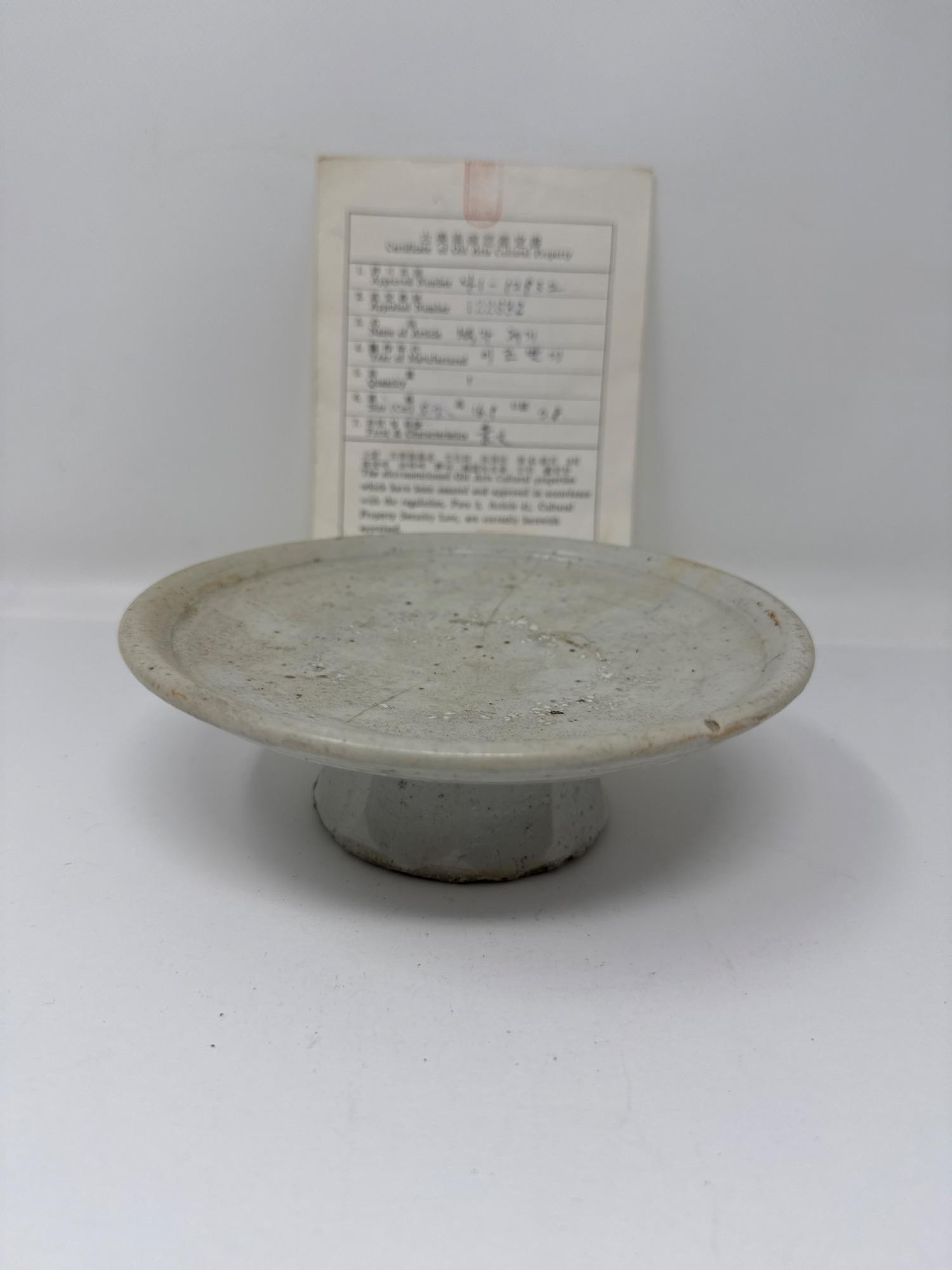 Antique offering bowl with pedestal. Has hairline crack in the middle. Include certificate of old arts cultural property with stamp. Appraisal number 122632, circa 1978.