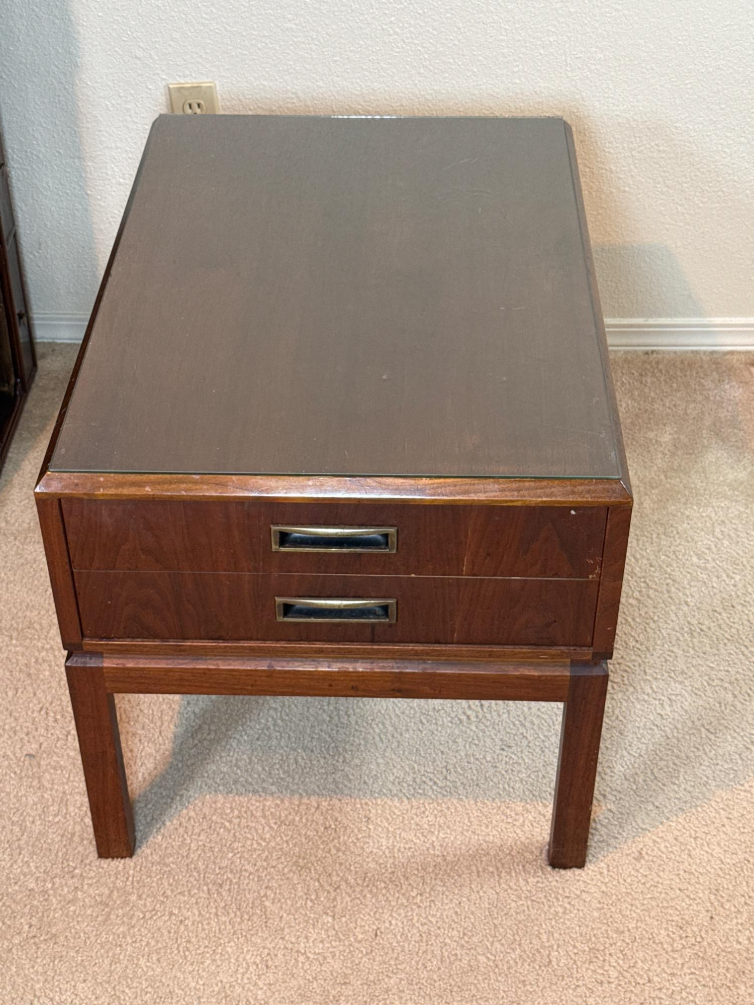 MCM Drexel Declaration Dark wood colored end tables. Two large drawers. With vintage brass hardware.Dovetail construction. Glass piece for top of table. Beveled edge table.