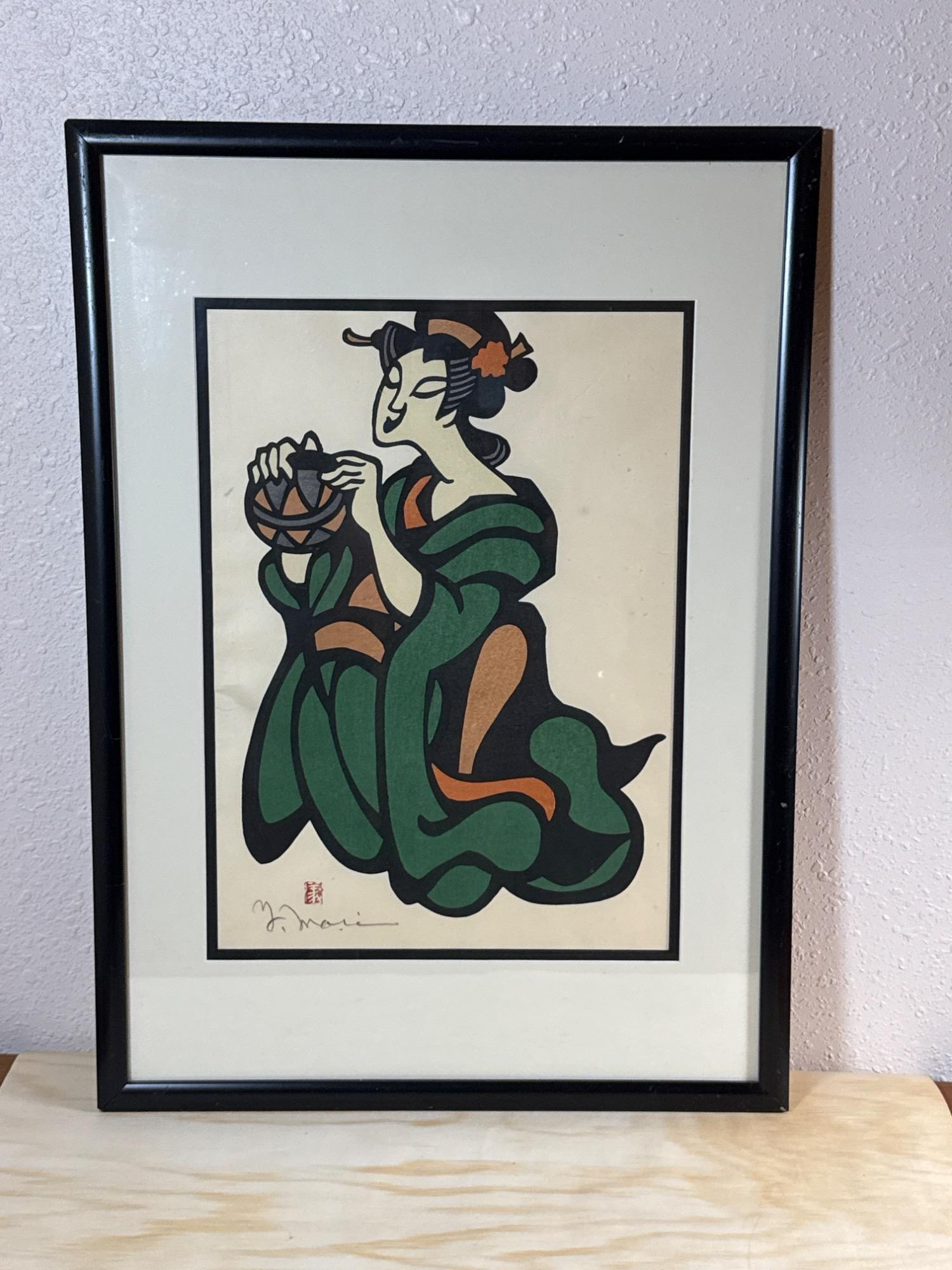 Geisha with a tamari ball. Wood block print by Mori Yoshitoto. Signed by artist.