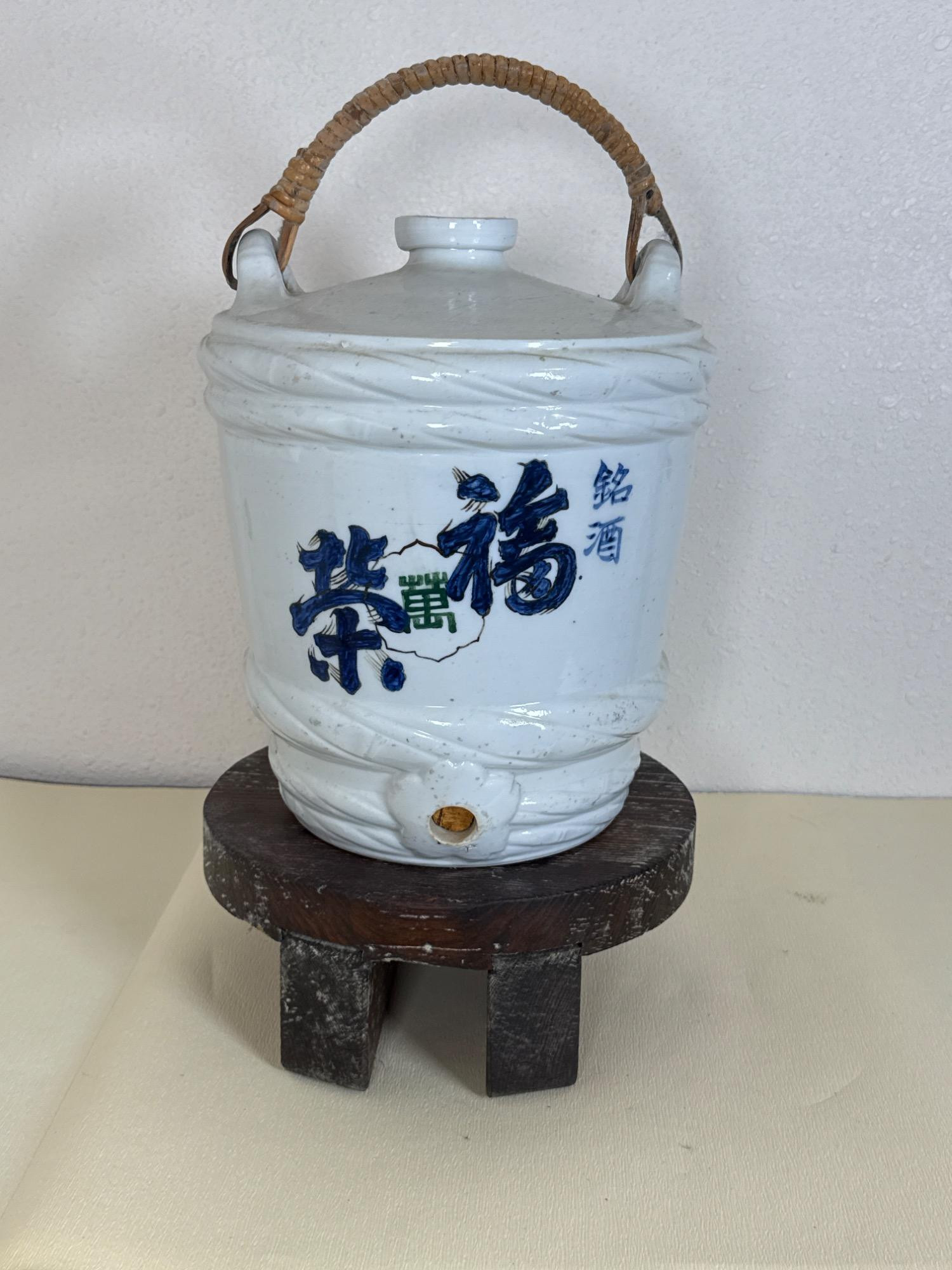 Heavy duty wood stand. Needs cleaned up. Large sake barrel with woven handle. Porcelain with wood stopper. Cannot get stopper out Heavy. Small chip on top of spout