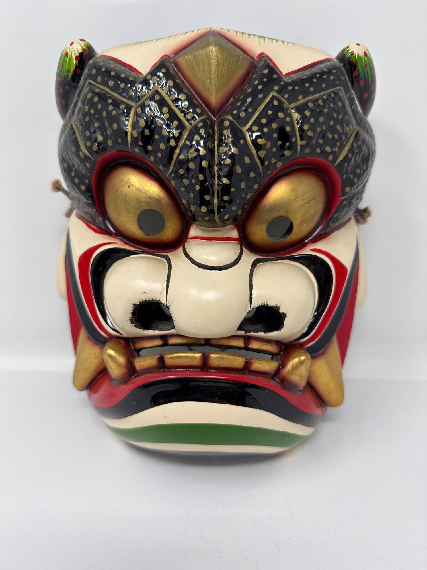 The God of sumo wrestling. Vintage hand carved mask. Hand painted and glazed. Signed Heavy, solid wood mask