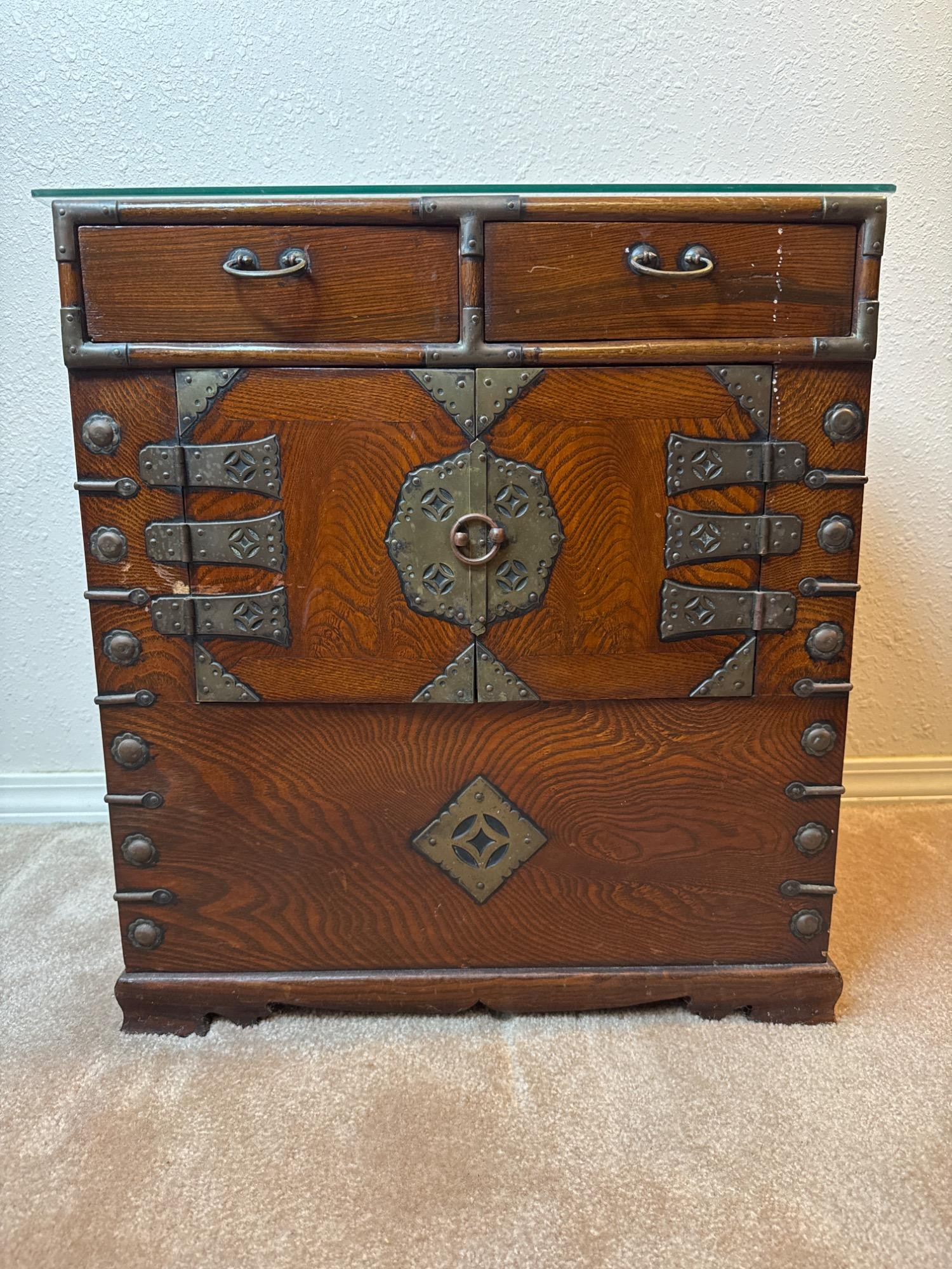 Vintage Korean Side Cabinet. Two drawers and one large compartment with flipped down door. Original metal hardware and details. Glass top is removable. Small chip near one hinge.