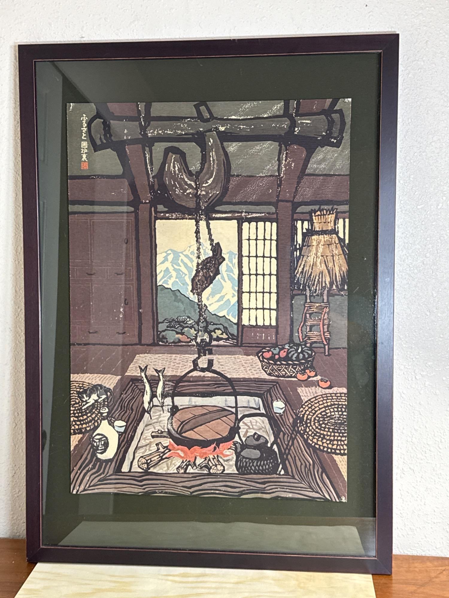Framed print of Japanese interior school scene. Also matted. Paper on back says Irori sunken hearth. Please note-there is some minor wear on this print, see photos.