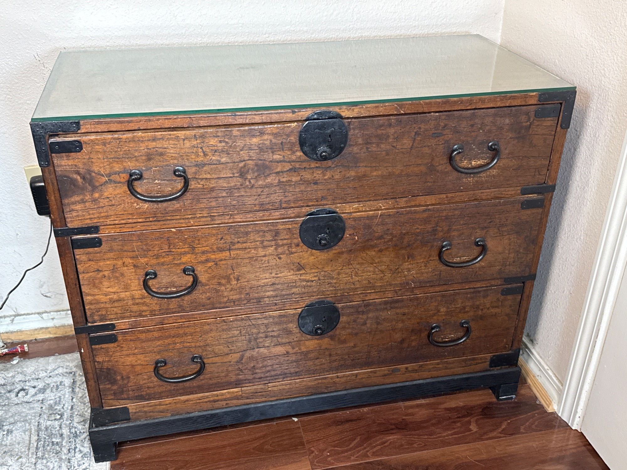 Antique Korean Tansu Kimono Dresser Chest. Three drawers. Lots of metal hardware and details. Removable base. Handles on each side for transport. Locking latch on each drawer. Glass piece has been added to top.