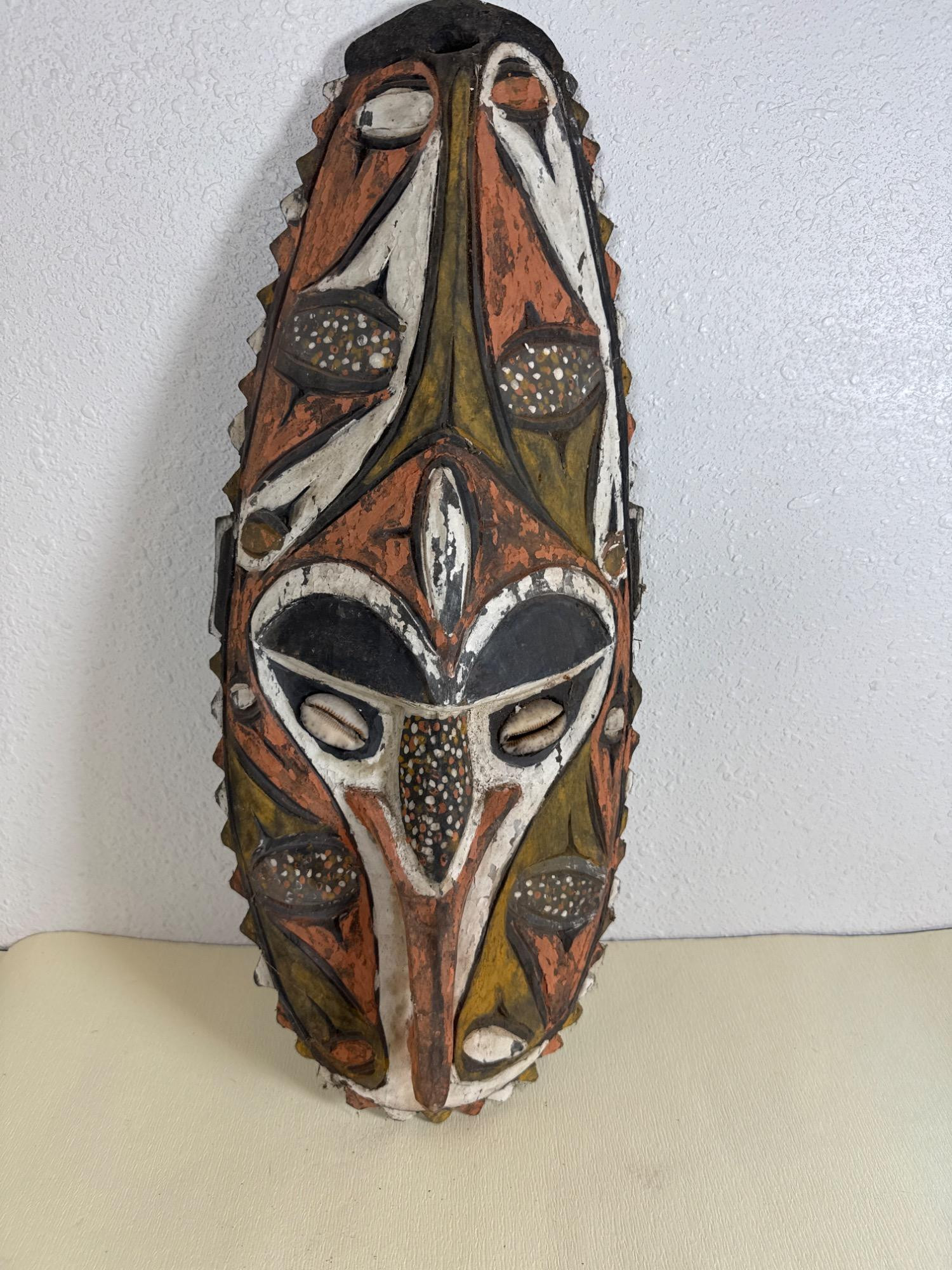 Hand carved and hand painted. Seashell eyes. Paint is raw and organic. White heart bird face. Papua New Guinea/ Oceana Art