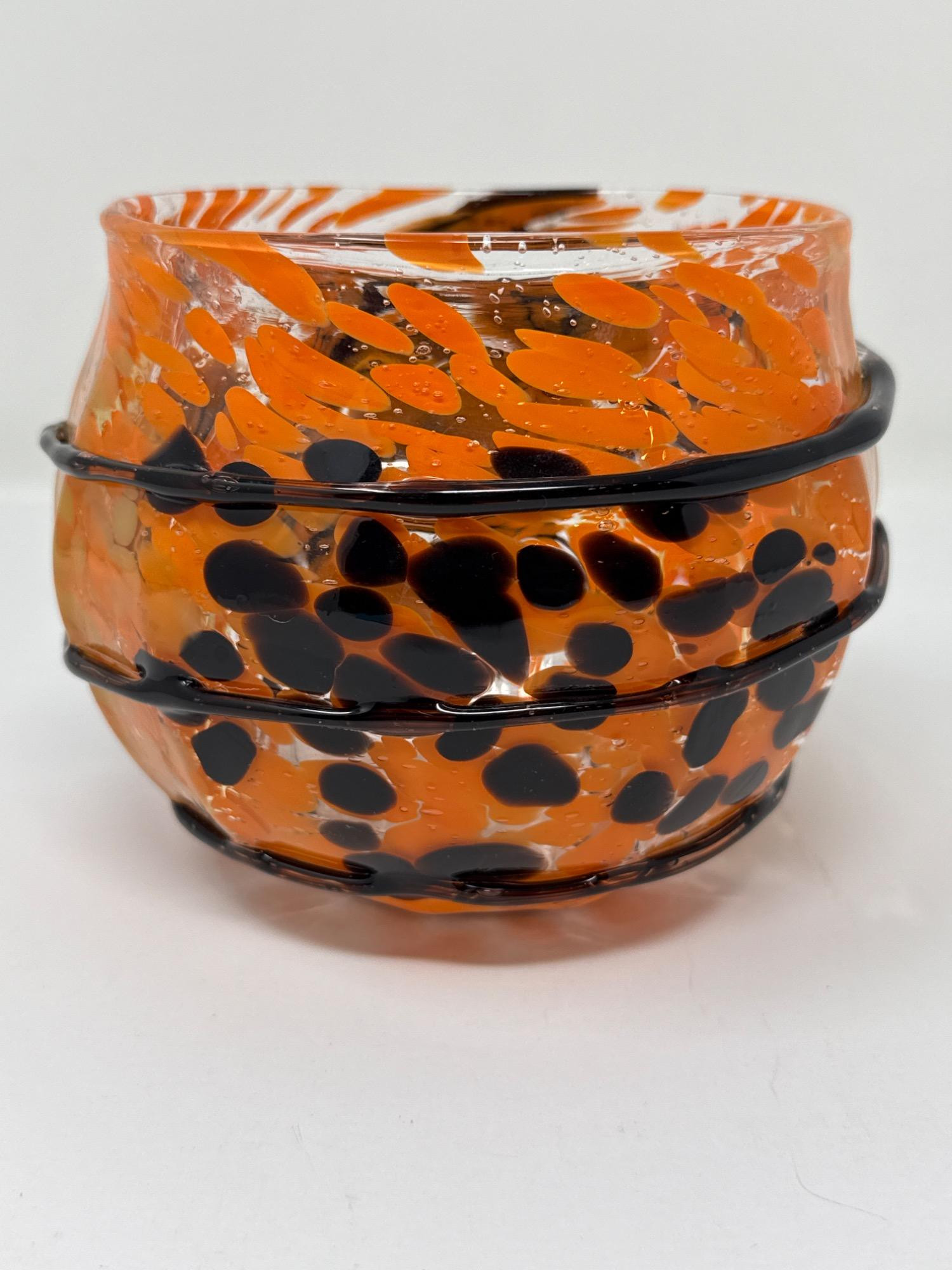 Hand blown glass. Signed 1999. Orange, black and clear glass. With black glass swirl detail on outside.