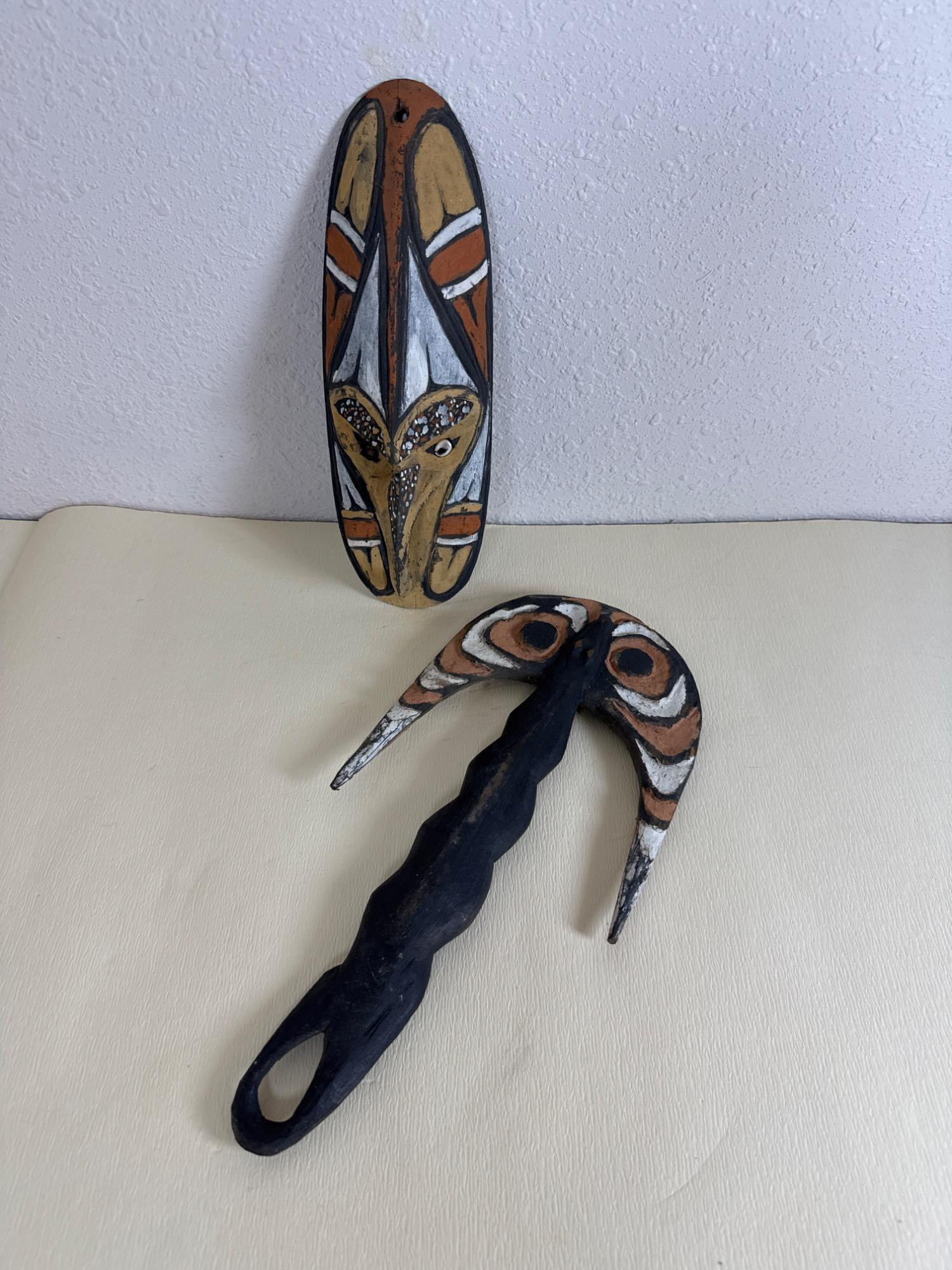African, Oceana region mask Wall Hanging and Tribal Hand Carved Totem Hand carved and painted wood mask. Hand carved and painted wood totem. Seashell eyes. One is missing. Origin unknown. Heart faced bird icon
