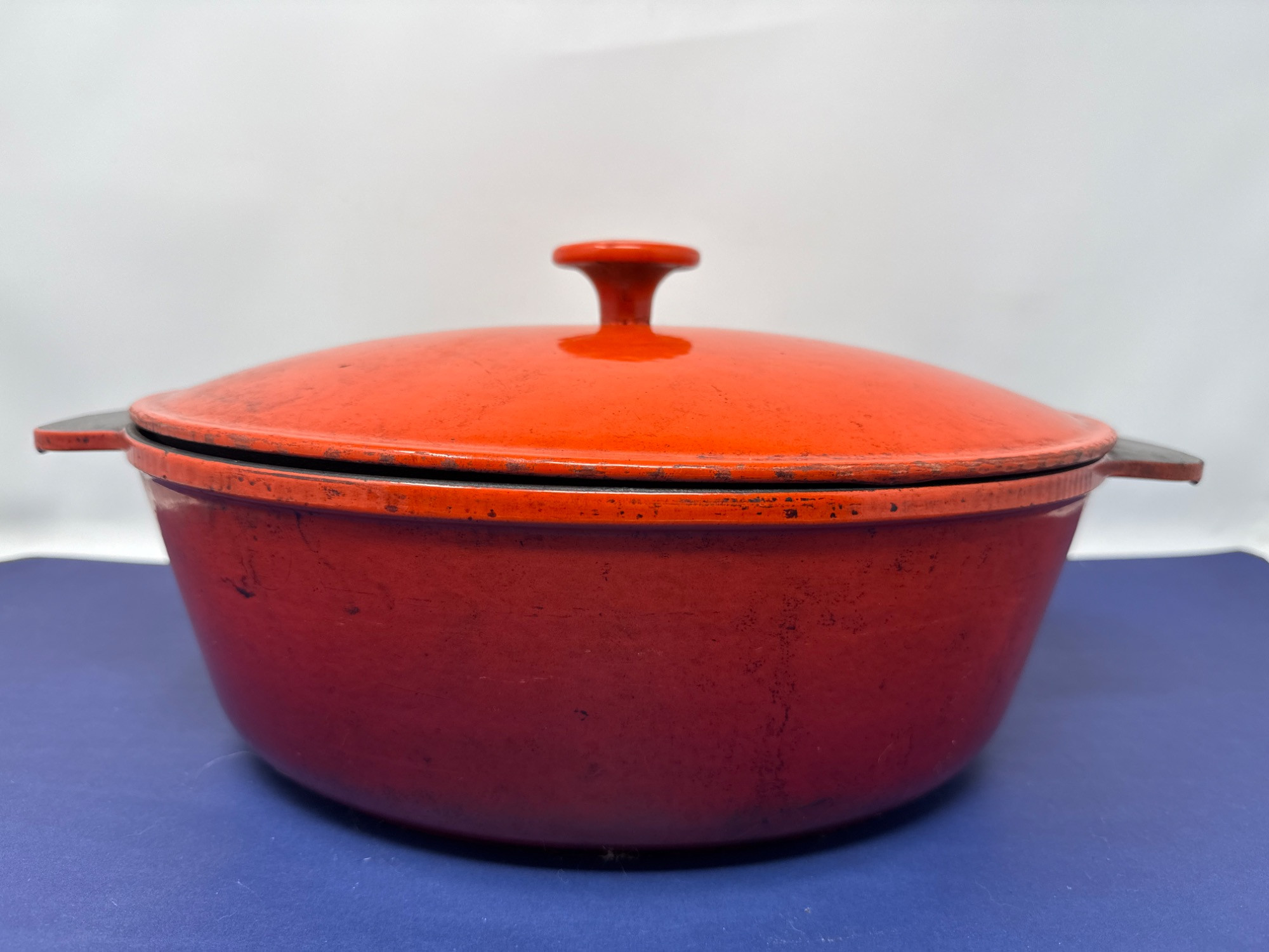 Vintage orange cast iron and enameled Dutch oven. Made in France. Needs a little cleaning to refresh. In great condition.