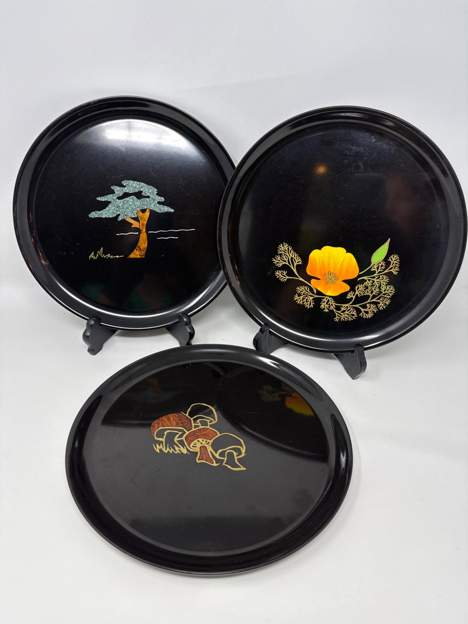 Vintage Couroc Black Lacquer Tray Trio. Mushrooms, poppy, Tree theme. Mushroom and Tree have inlaid wood pieces. Mushroom has a scratch.