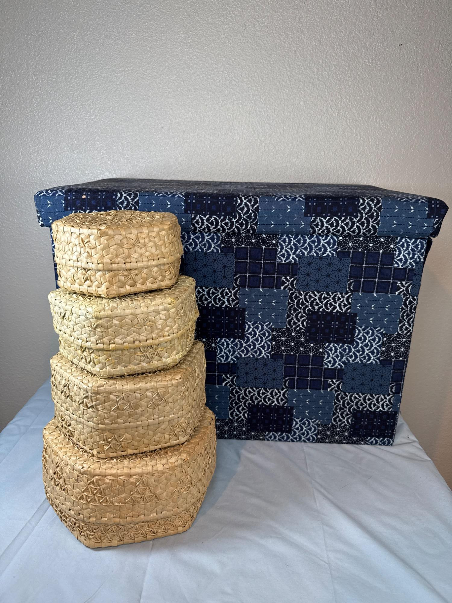 Vintage tea chest with blue patchwork fabric. Interior is lined with metal. Lightweight. No visible damage. Four graduated hexagonal woven baskets. Woven detail on baskets. Baskets are nesting.