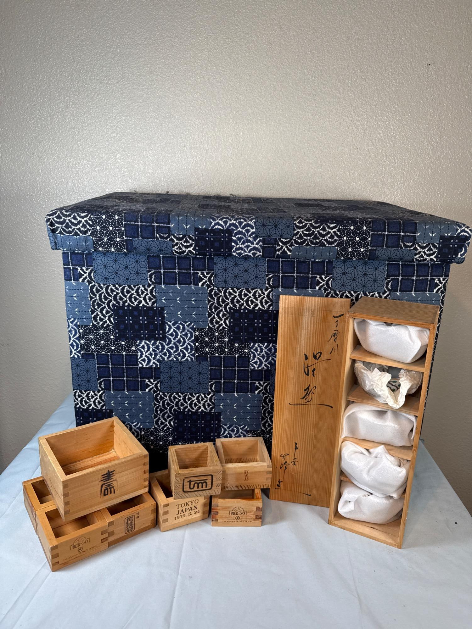 Blue patchwork fabric covered tea chest. Lined with metal inside. In good condition. Clean with no visible damage. Assorted wood tea boxes. New set of porcelain teacups. In original wooden box.