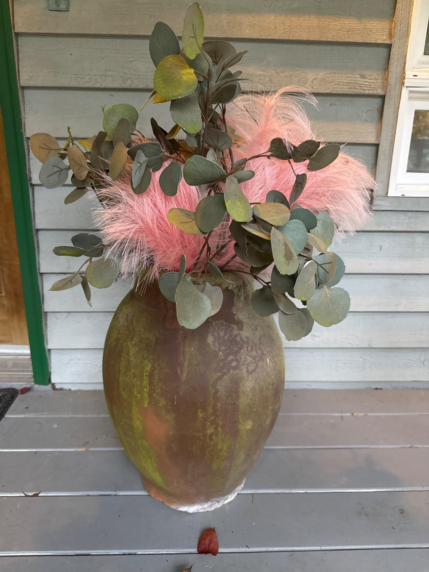 Large terra-cotta water barrel has been outside but covered. Large and heavy. Foux plants included. Maker's mark stamped into barrel.