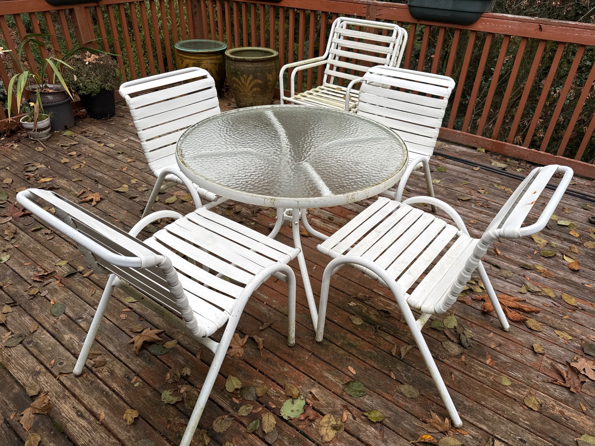 Round table with four matching chairs. Two extra chairs are similar. Vinyl wrapped with metal frames. Has been outside and needs cleaned. Glass top is in good condition.