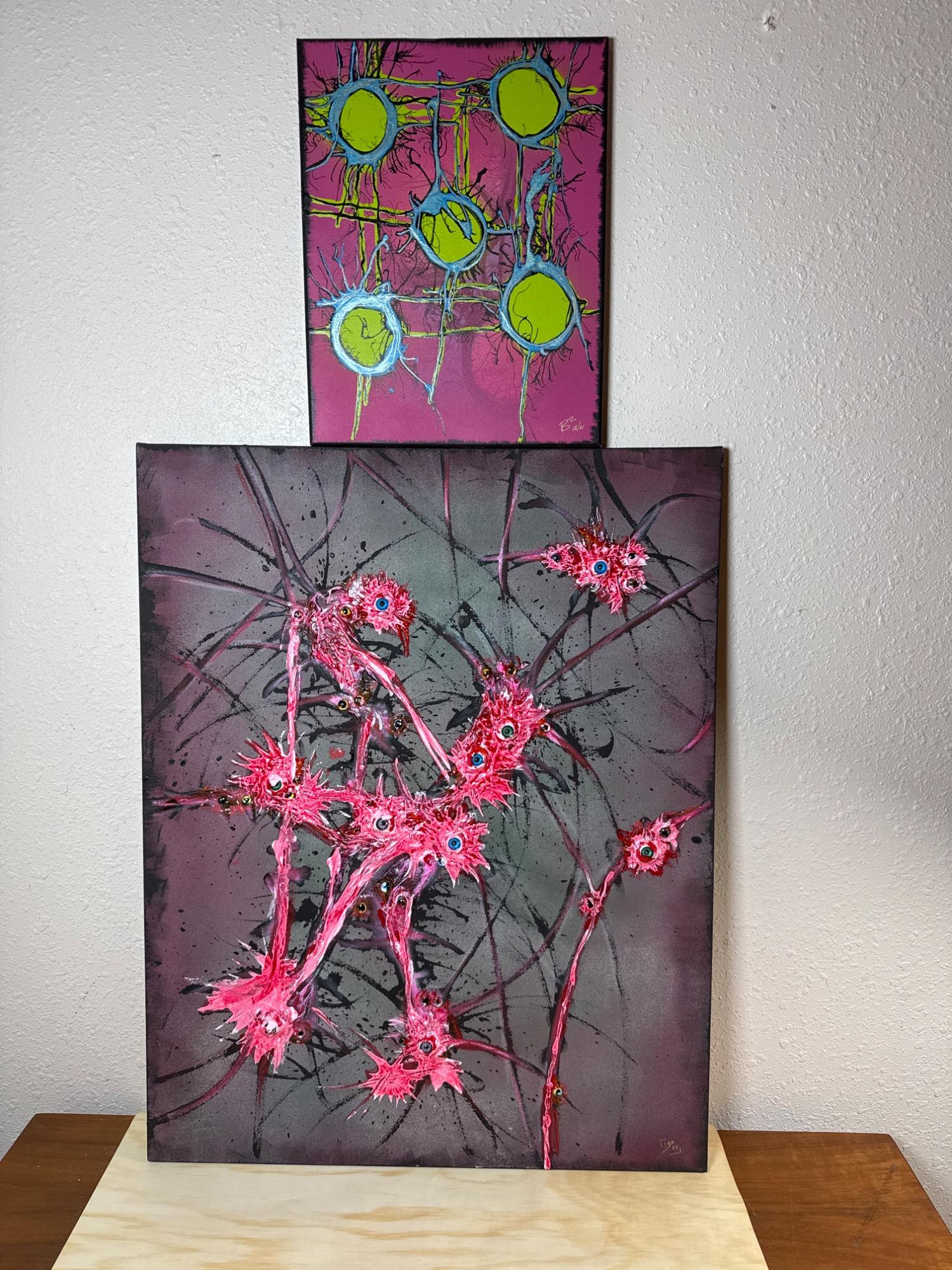 Bold and graphic art on vinyl. Smaller print is 14 inches tall, 11 inches wide. Signed and dated. Same artist signed and dated the eyeball art piece. Lots of texture and color.