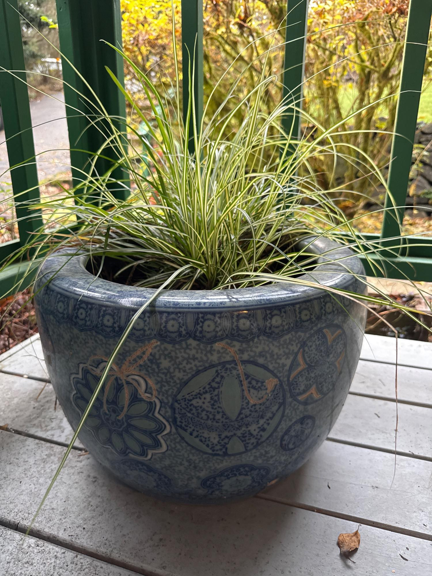 Health of plant cannot be guaranteed at pick up. Large blue ceramic planter. Pink painted detail. Very heavy.