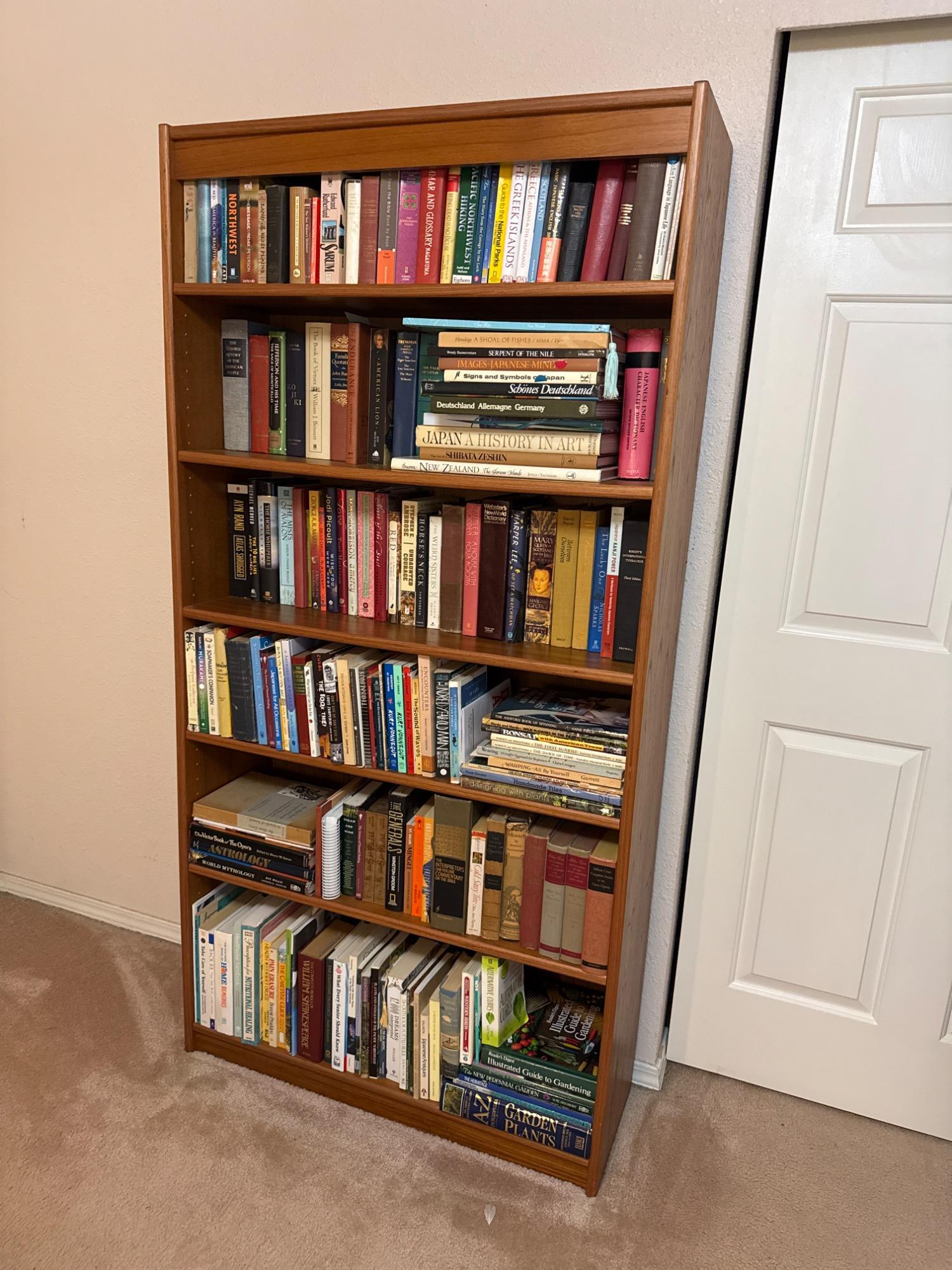 Enormous book collection. Everything from languages, novels, gardening, Health, religion, astrology, crafts, opera. Authors like TS Elliott to Kurt Vonnegut. Tony Morrison and Ayn Rand. Several books of Japanese culture and Travel. Bookcase with four adjustable shelves. Teak colored wood. Wood with laminate. Several gems in this lot.