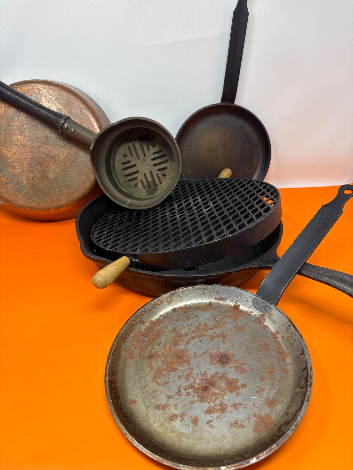 Vintage kitchen pans. Round copper pan, two flat skillets. Large cast-iron pan with removable grill pan. Wagner’s 1891 original cast-iron cookware. 11 3/4 inch skillet. Brass Hinoshi ladle