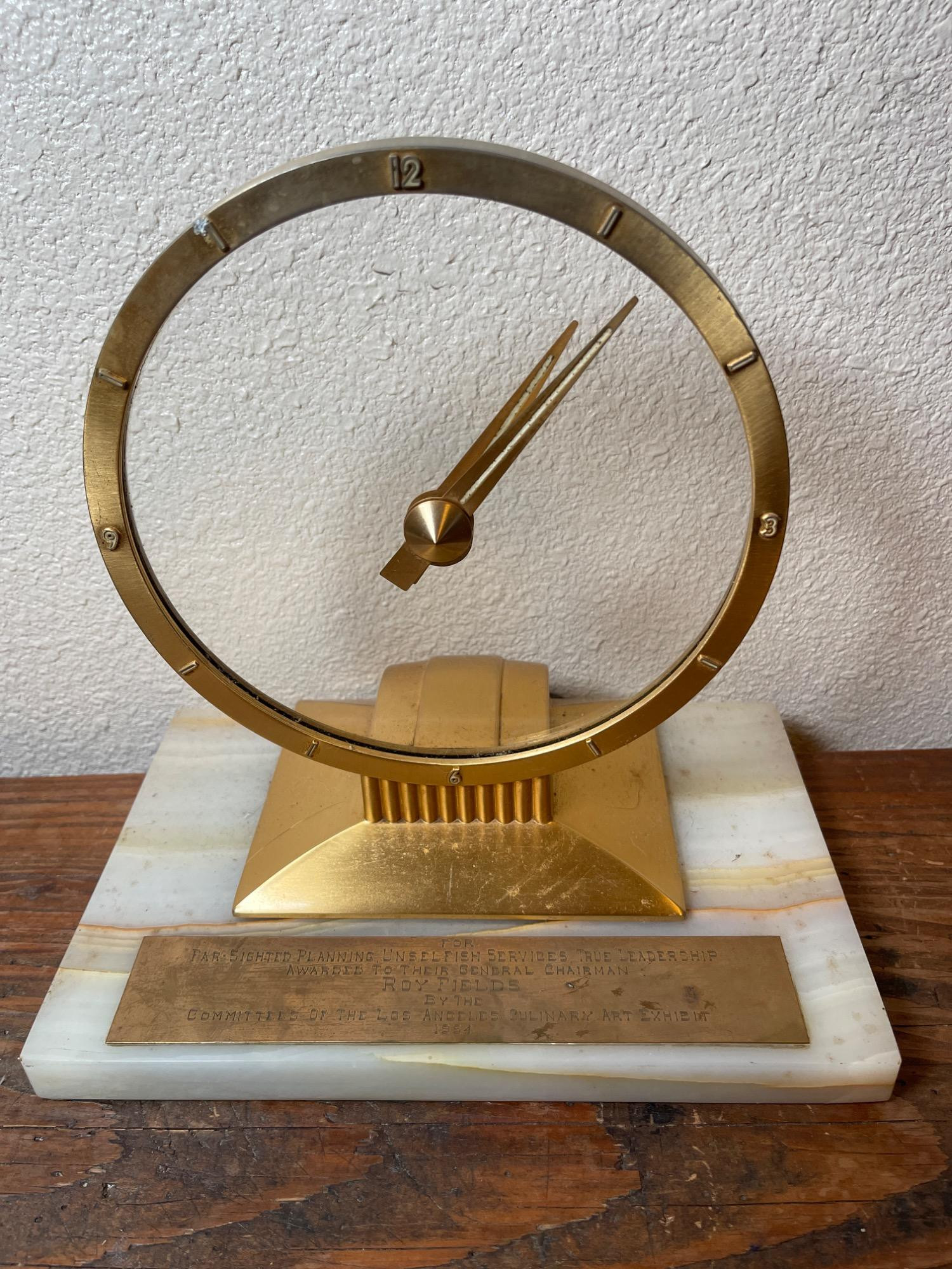 MCM Jefferson Golden Hour Electric Clock Clock is mounted on a marble base. Plugged clock in and wasn't able to get it working. Clock can be removed from base, the base is not original to the clock. Closck does have some wear, please see pictures.