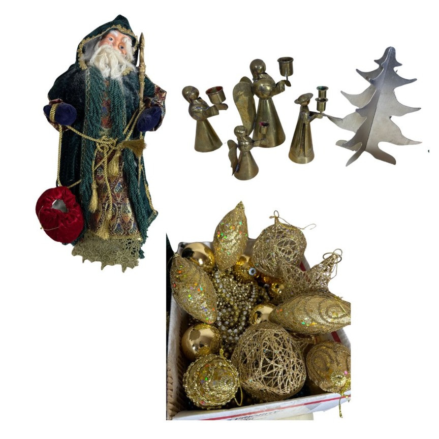 Gold toned Christmas decor. Gold ornaments that are spun with beads and glitter. Brass snowflake ornament. Brass angel candleholders. Brass collapsible tree. Large brass bells. Large Santa with ceramic head. Wreath and gold star. Box full of gold and silver beads and ornaments.