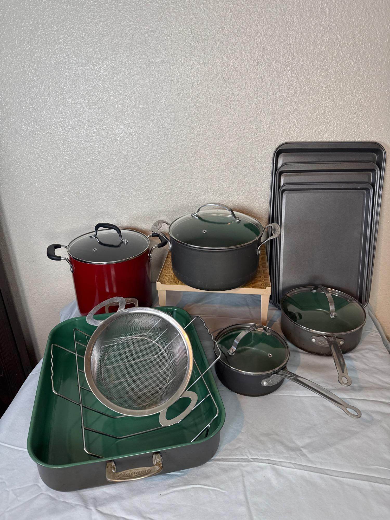 Orgreenic enamel pots. Roasting pan, sauce, pan, cook pot, stock pot. Pots have vented lids. Roasting pan has removable rack. Three sheet pans of different sizes. Hardly used. T-Fal stock pot with lid. Small footed strainer.