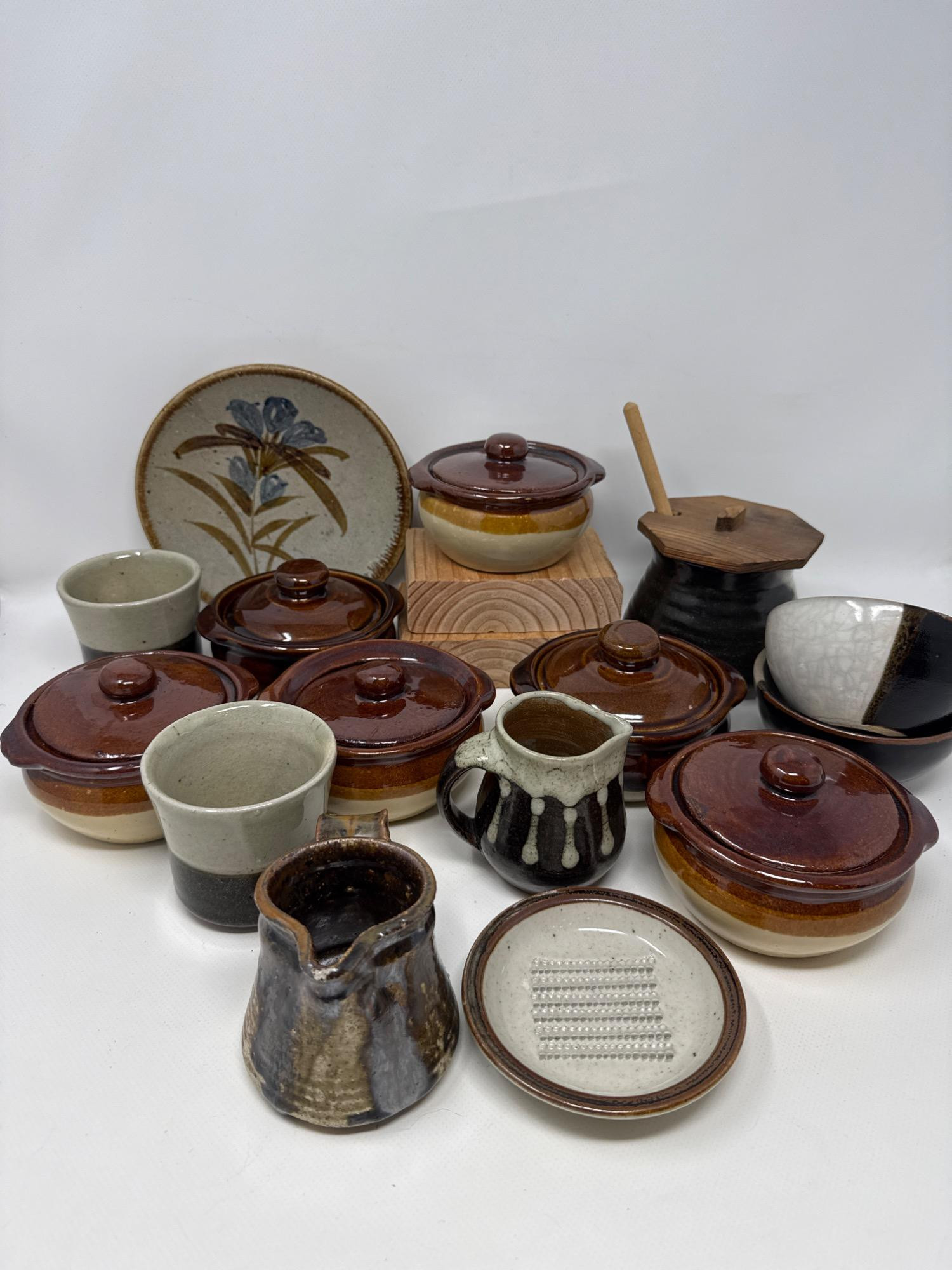 Glazed individual brown and cream soup crocks. Two small soup bowls and two cups. Two more added. Honey pot, two cream pitchers and garlic plate. Hand painted salad plate.