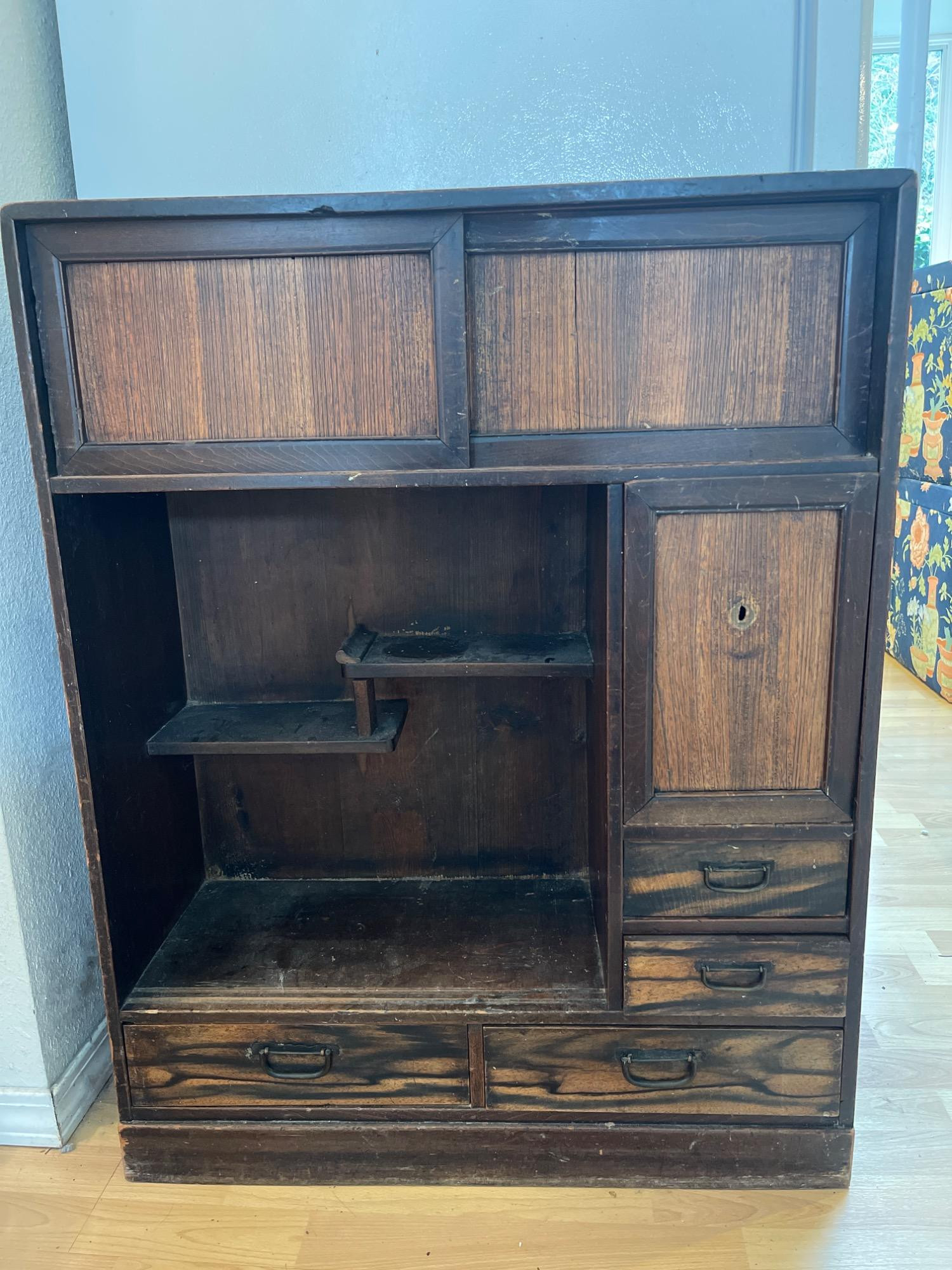 Vintage Cha Tansu tea chest with loads of storage. Original hardware. Lightweight Shows some age and wear. One door missing hardware.