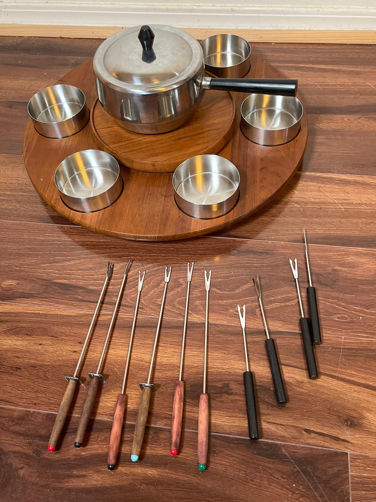Wood carousel tray for fondue set. Steel pot, fondue forks and bowls. Two sets of forks at different lengths. Two tiers, for pot and bowls.