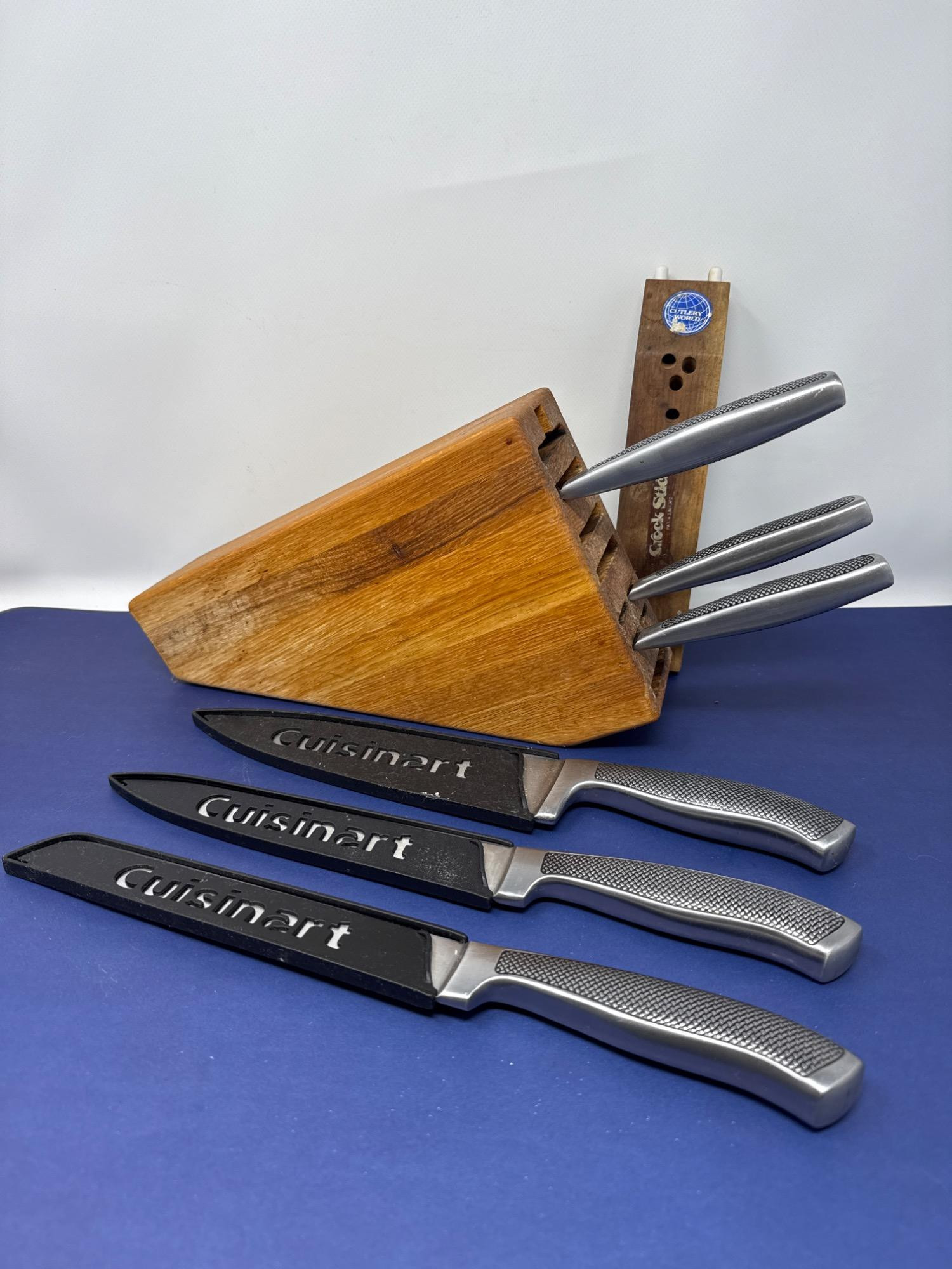 Classic Cuisinart knife set. Numbered series. Six knives total with Knife block and sheaths. Knife sharpening sticks in holder.