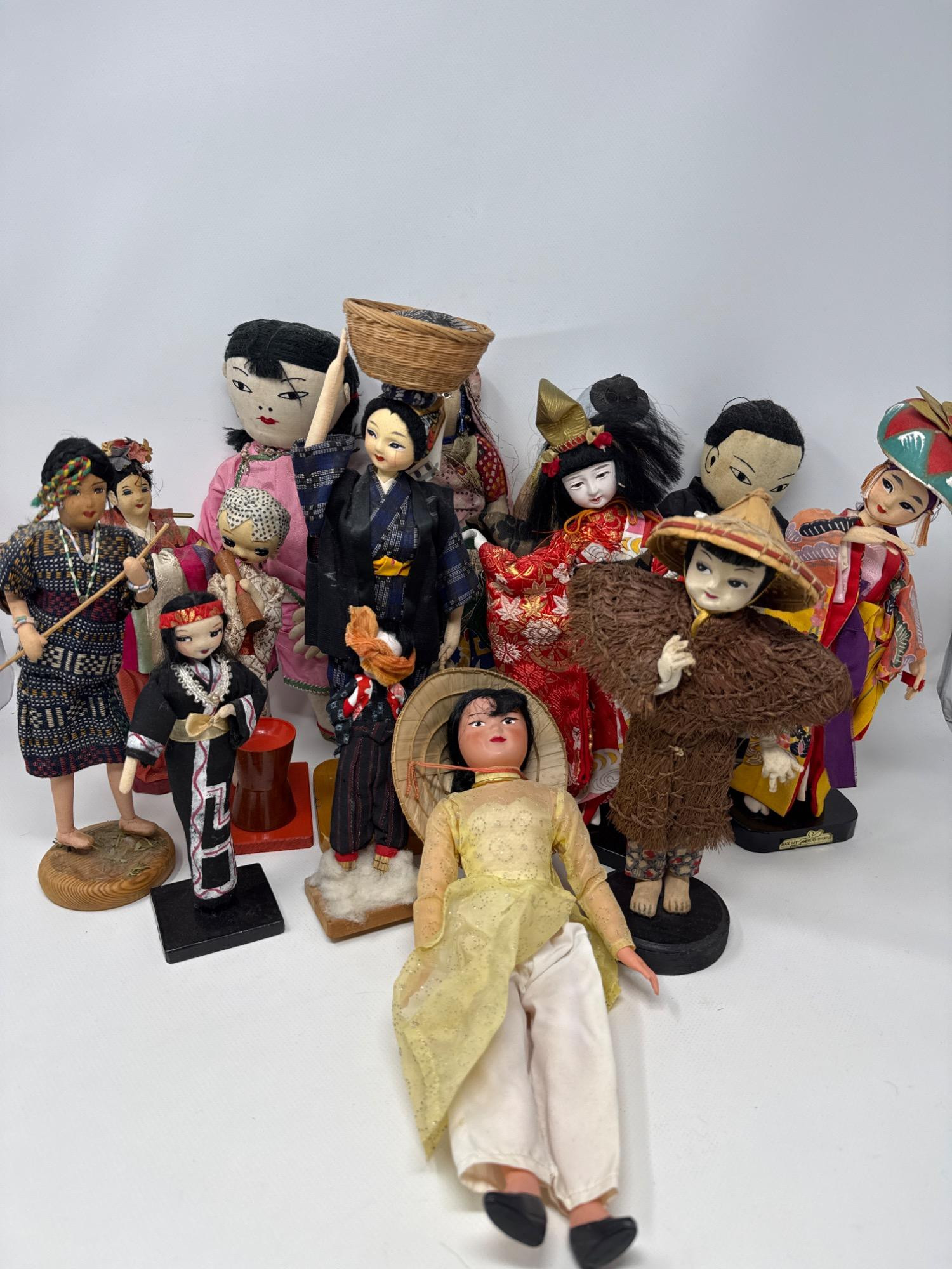 Assorted dolls of Asian descent. Materials and styles vary. Random sizes. All seem to be handmade.