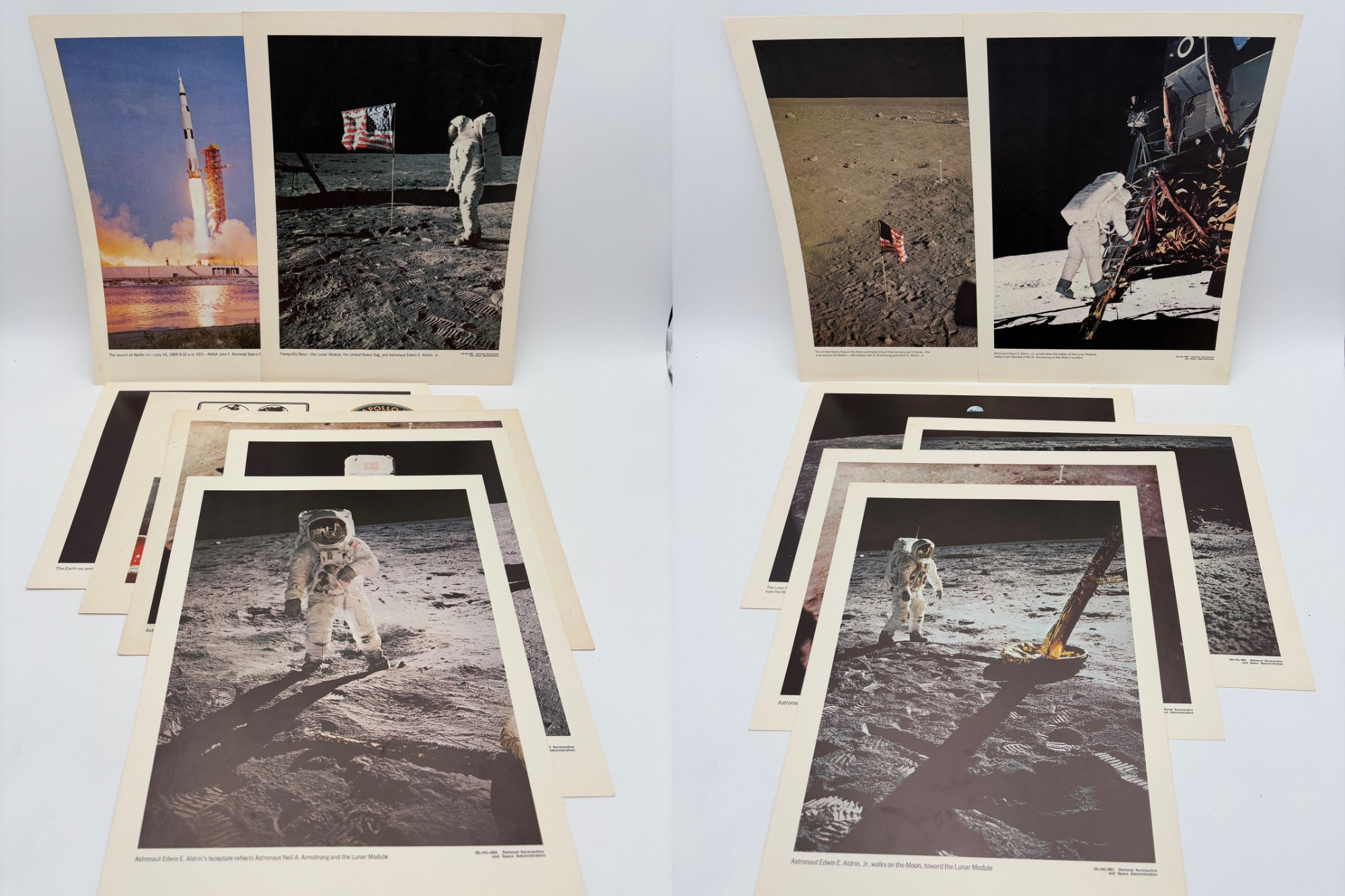 measures 11” x 14”. All are in good vintage shape, but there are a few mushed corners, mild handling creases, and signs of the paper aging. Note - there is a second copy of the two astronauts & the flag not included in the image count - the second copy has a severely creased edge (last photo). Please see photos for details.