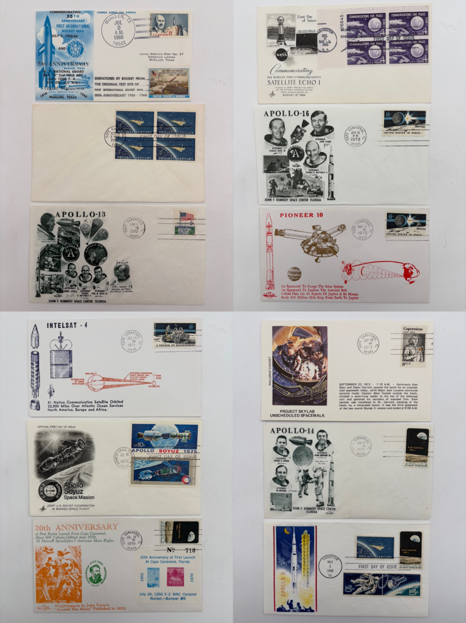 Postal Service space-themed/space-related First Day of Issue envelopes with stamps.