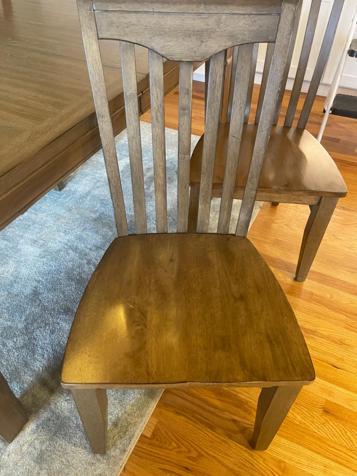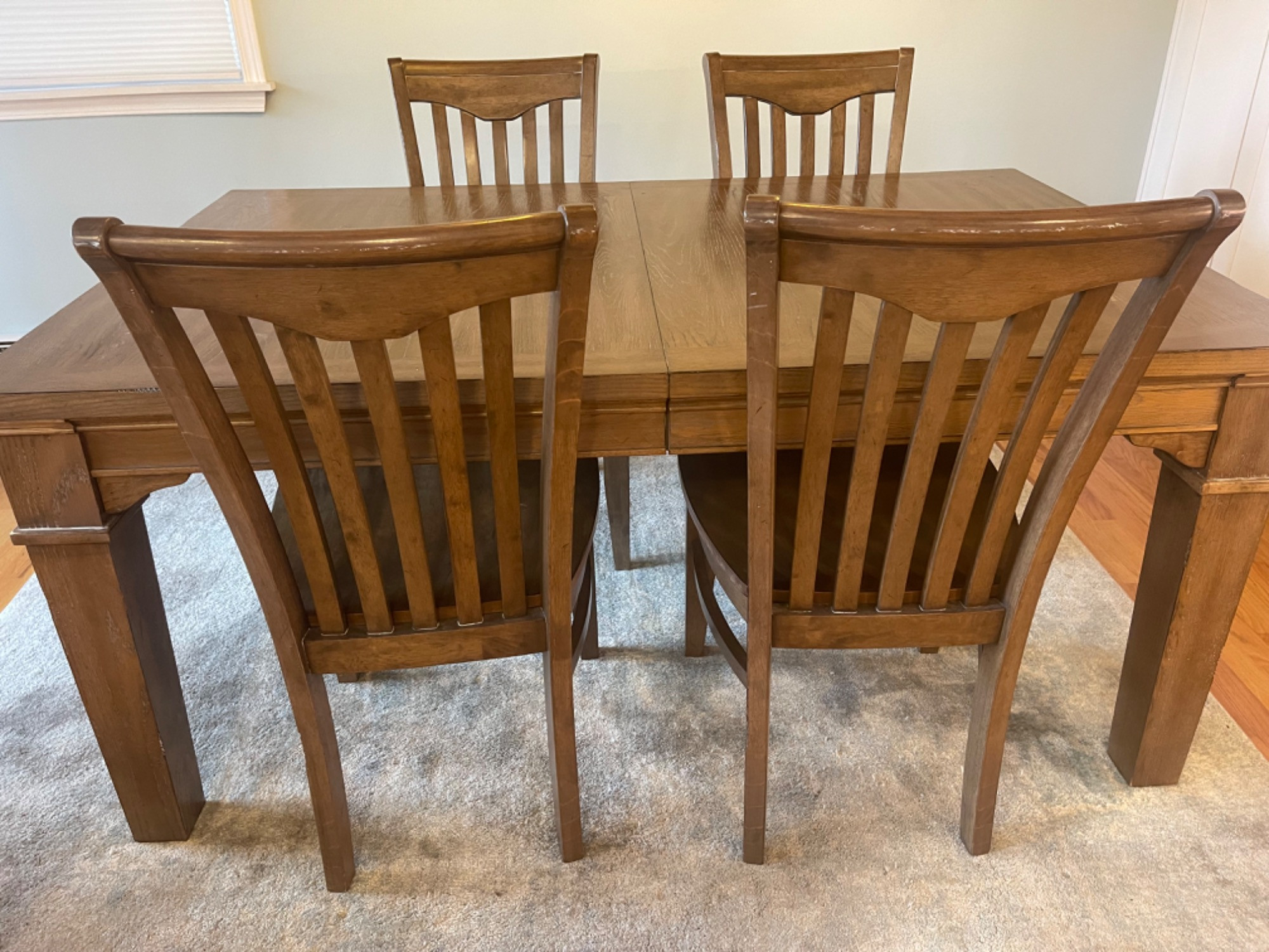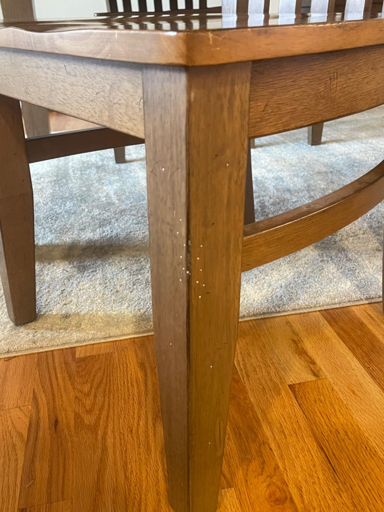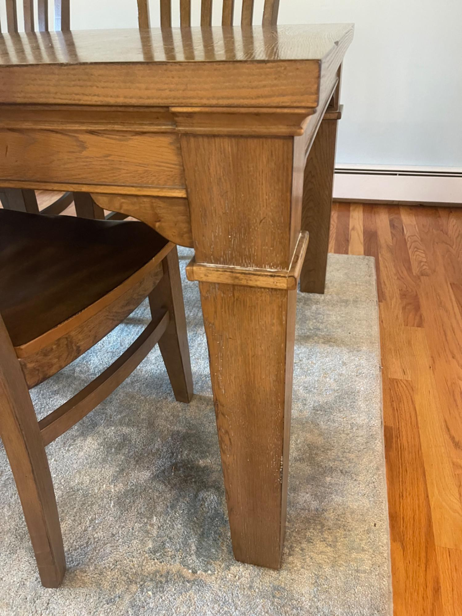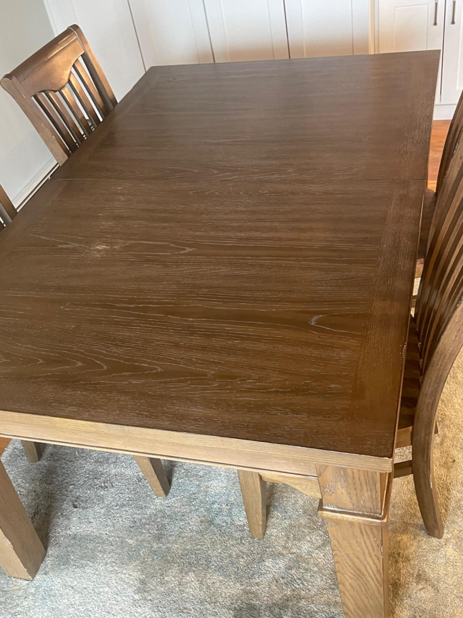 Winners Only Inc. Dining Room Table Table is in good condition, but has scratches, scuffs and stains from use. Please see photos for accurate representations of quality. Table: 66” L x 42” W x 30” H (without leaf) Chairs: 20.25” L x 18.25” W x 39.25” H Leaf was not taken out or inspected.