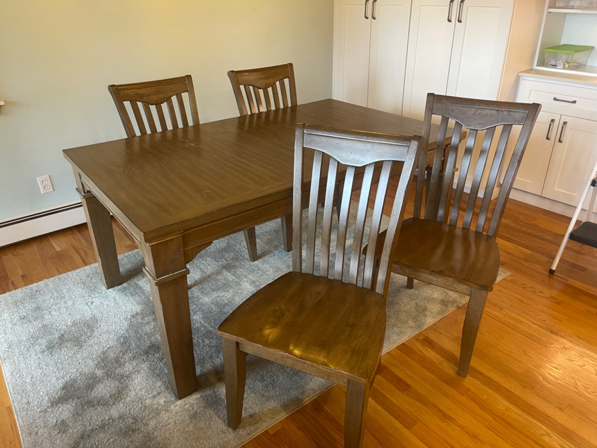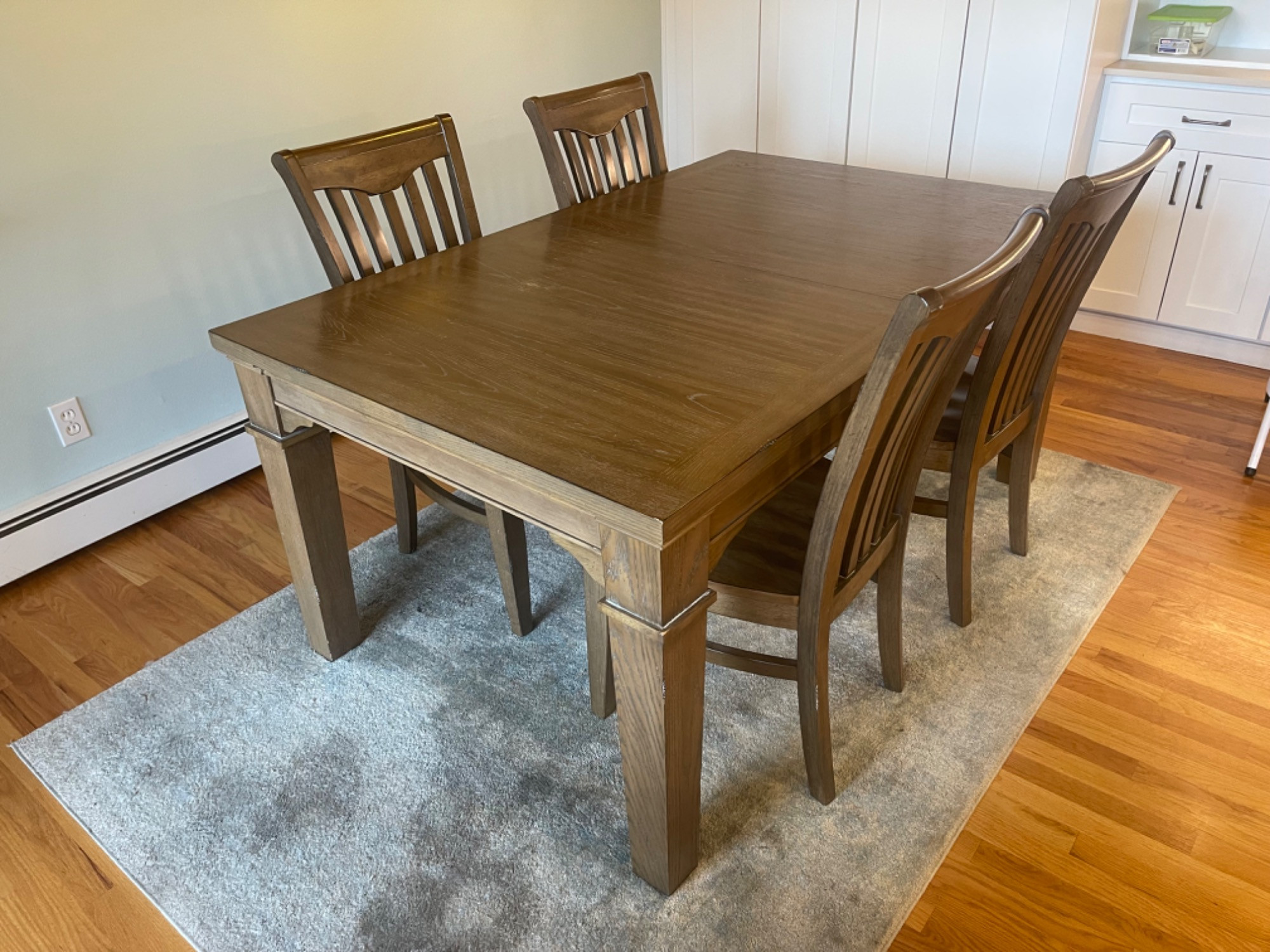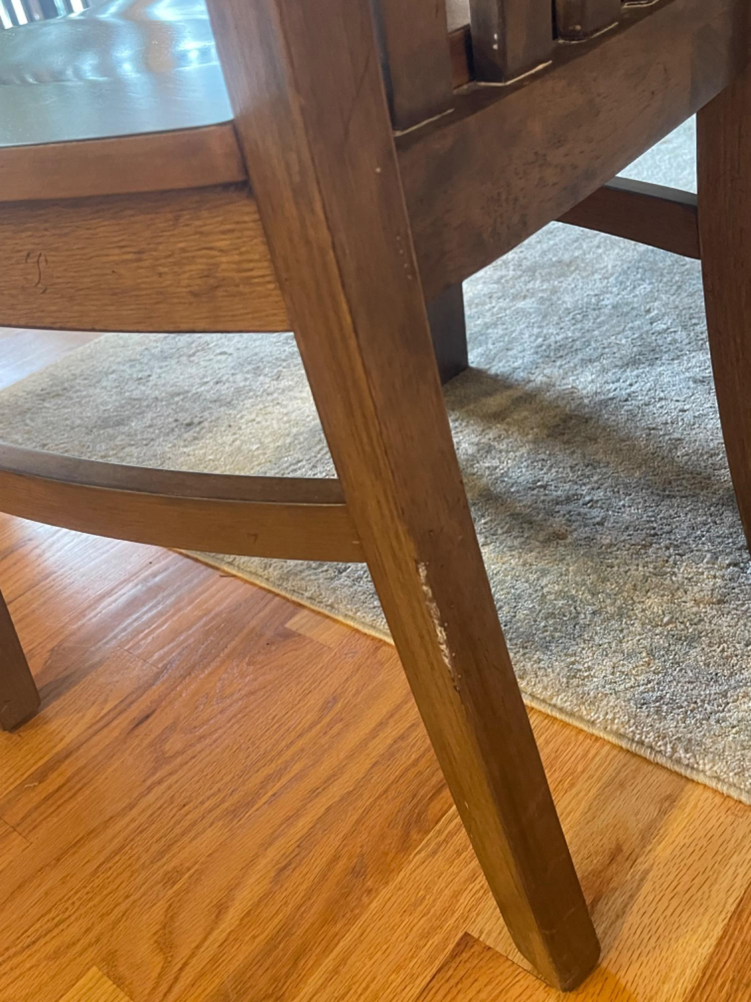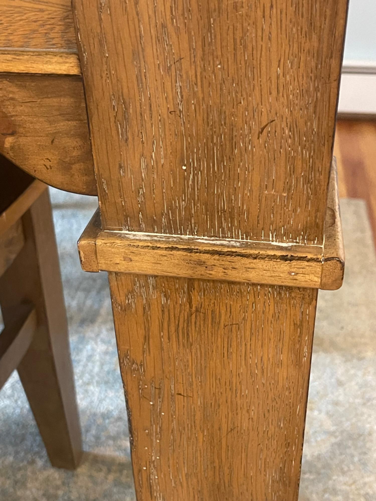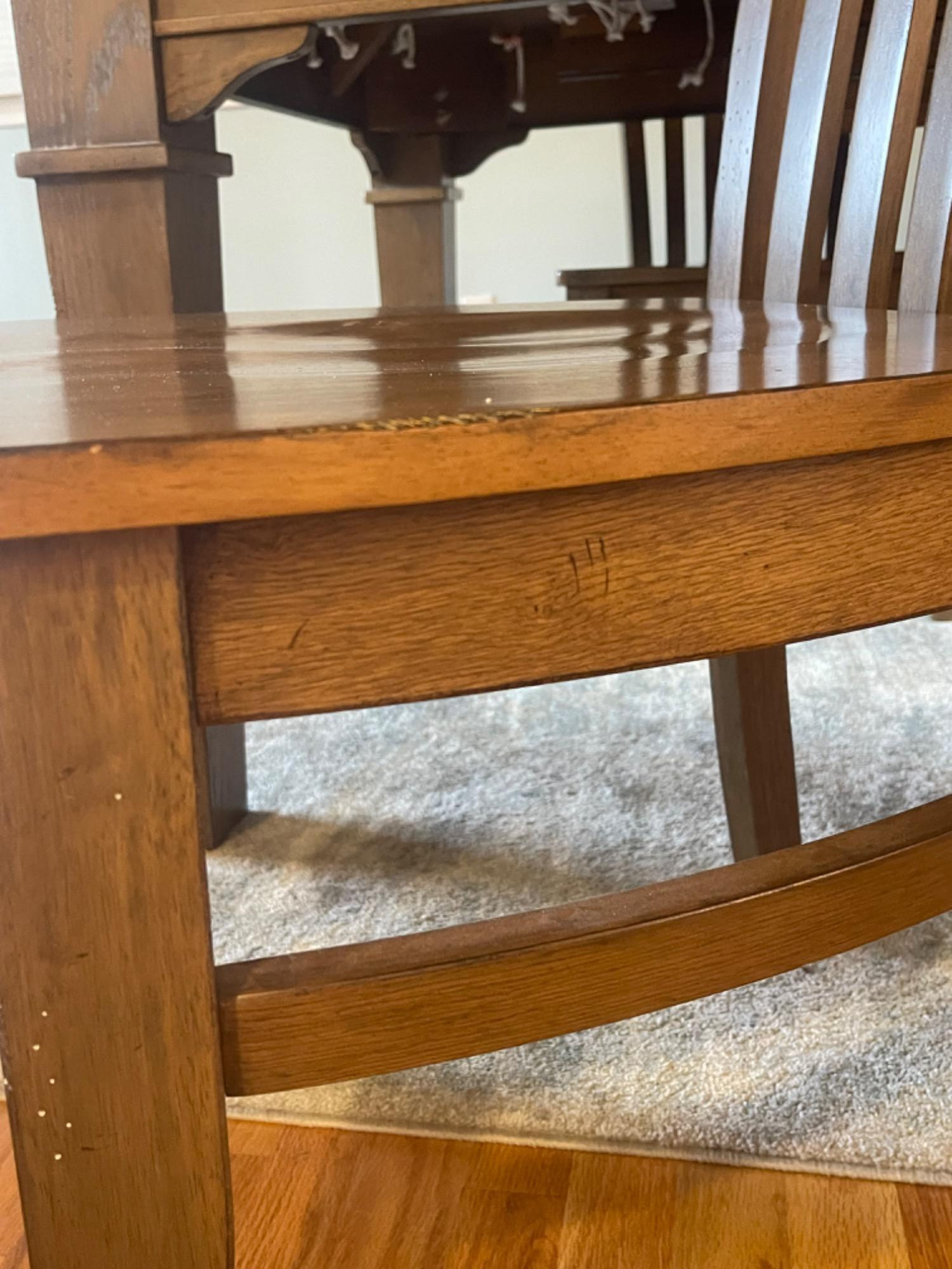 Winners Only Inc. Dining Room Table Table is in good condition, but has scratches, scuffs and stains from use. Please see photos for accurate representations of quality. Table: 66” L x 42” W x 30” H (without leaf) Chairs: 20.25” L x 18.25” W x 39.25” H Leaf was not taken out or inspected.