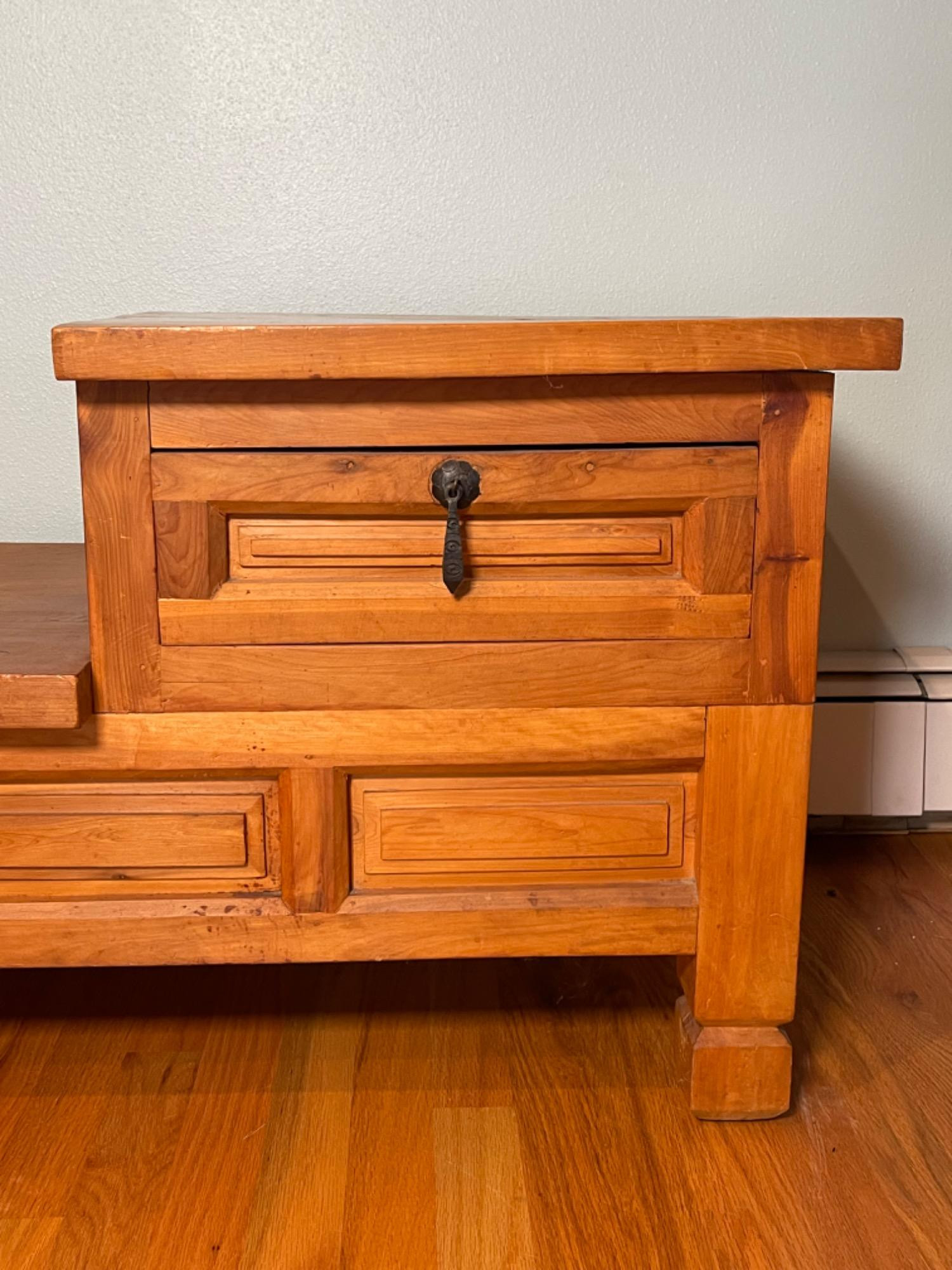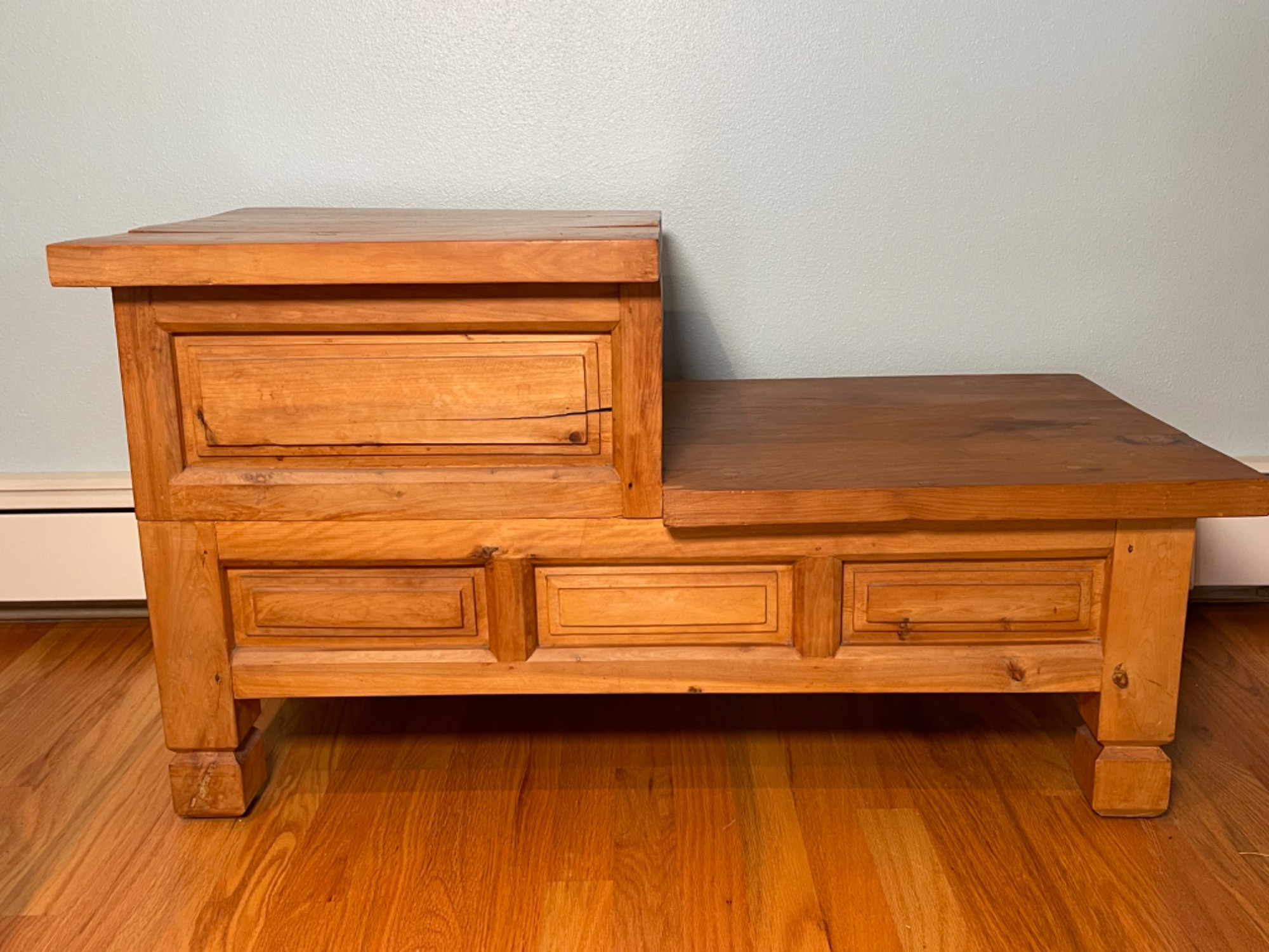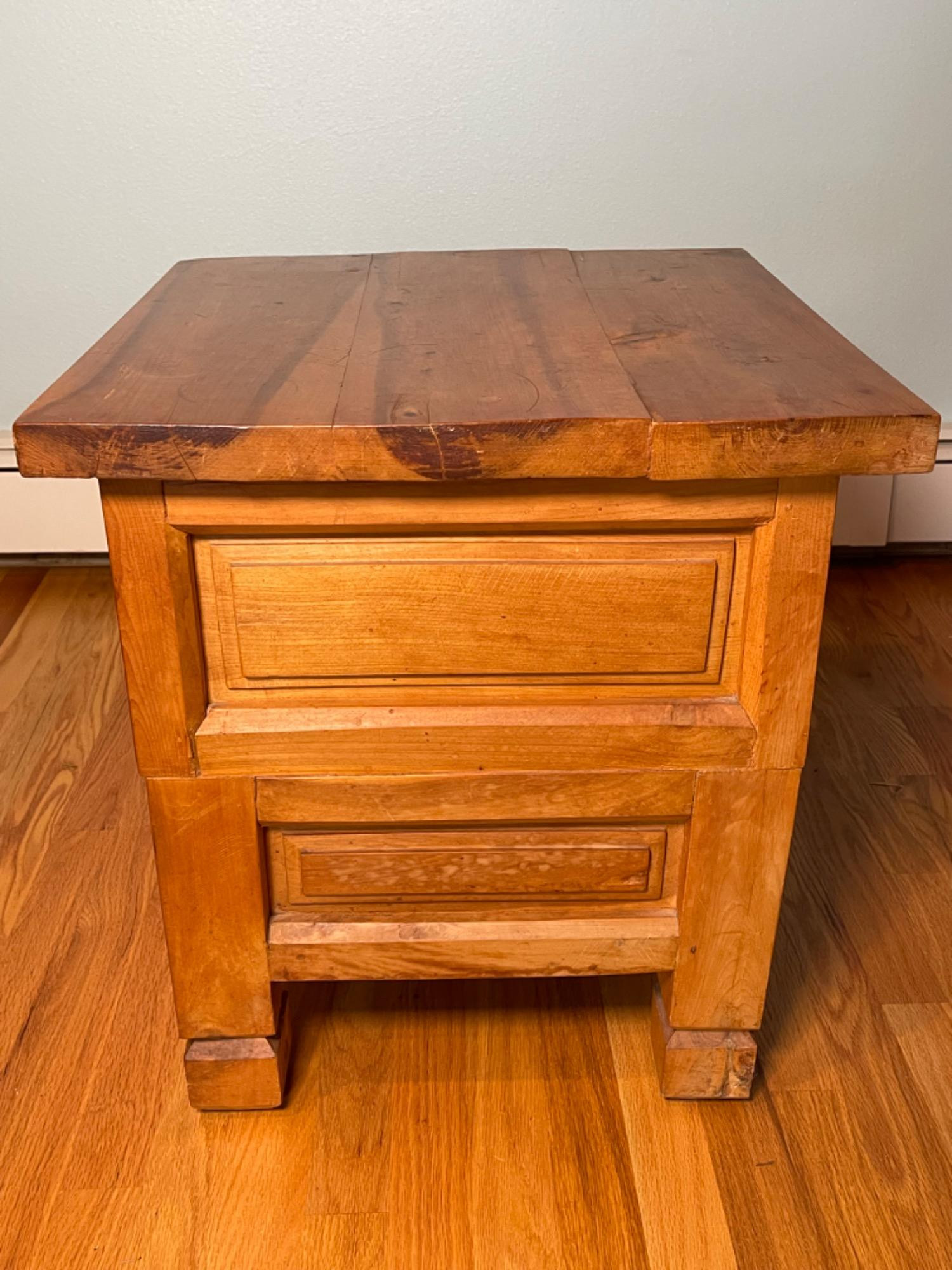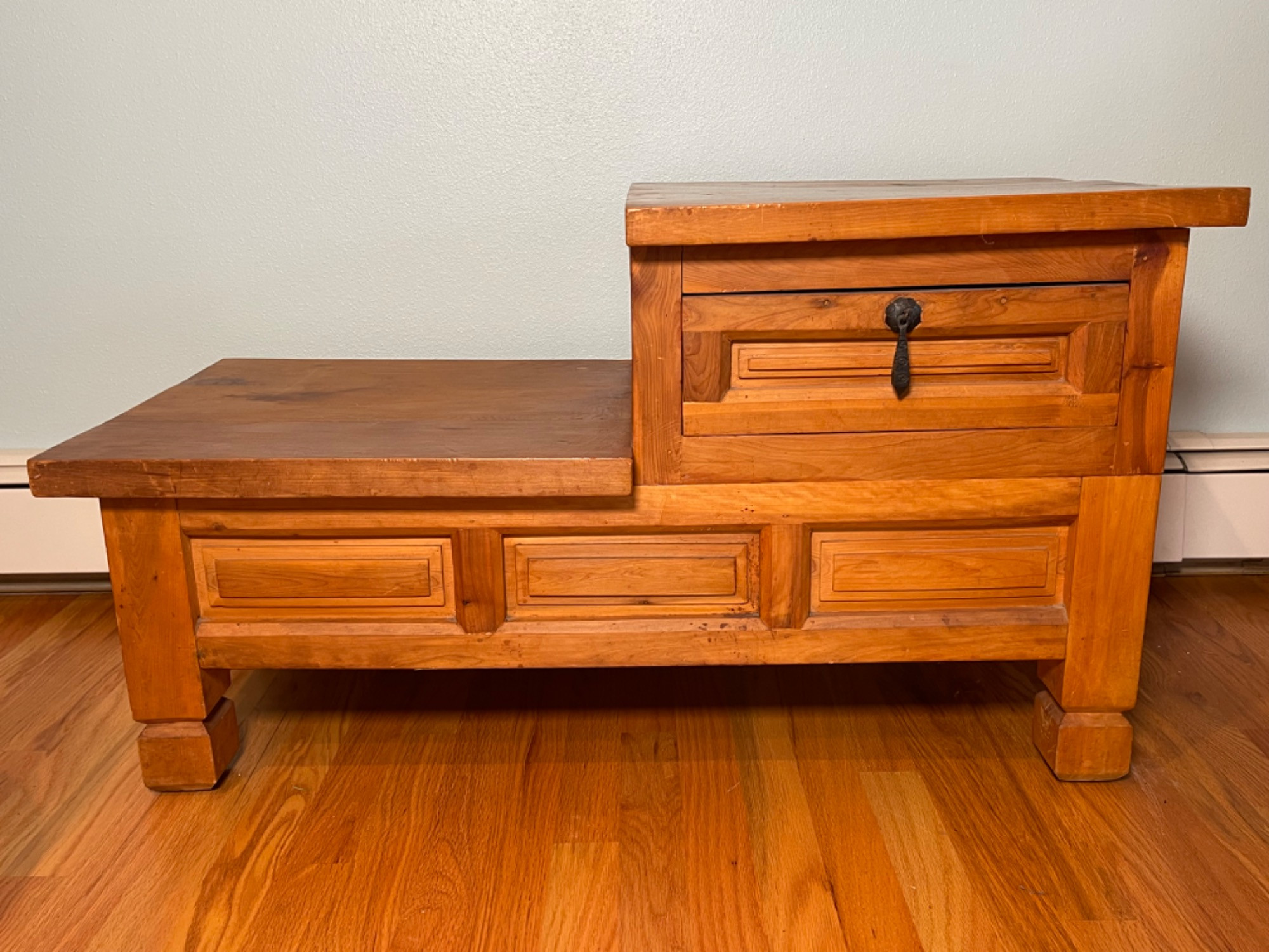 Vintage Hand Carved Solid Wood Tiered Side Table From Mexico Top appears to be a little uneven. Wood has some splitting, scratches, scuffs and stains but is in good condition.