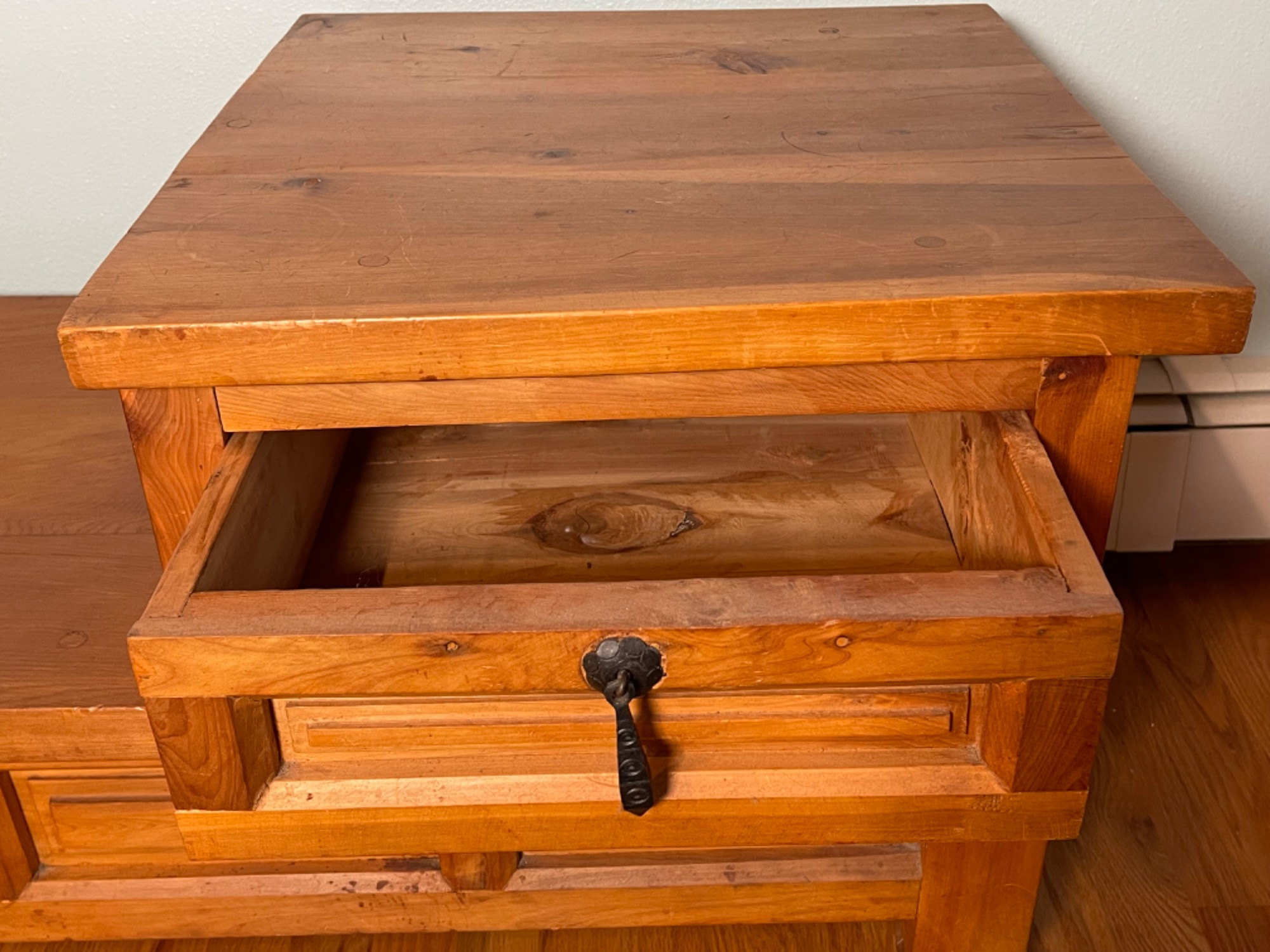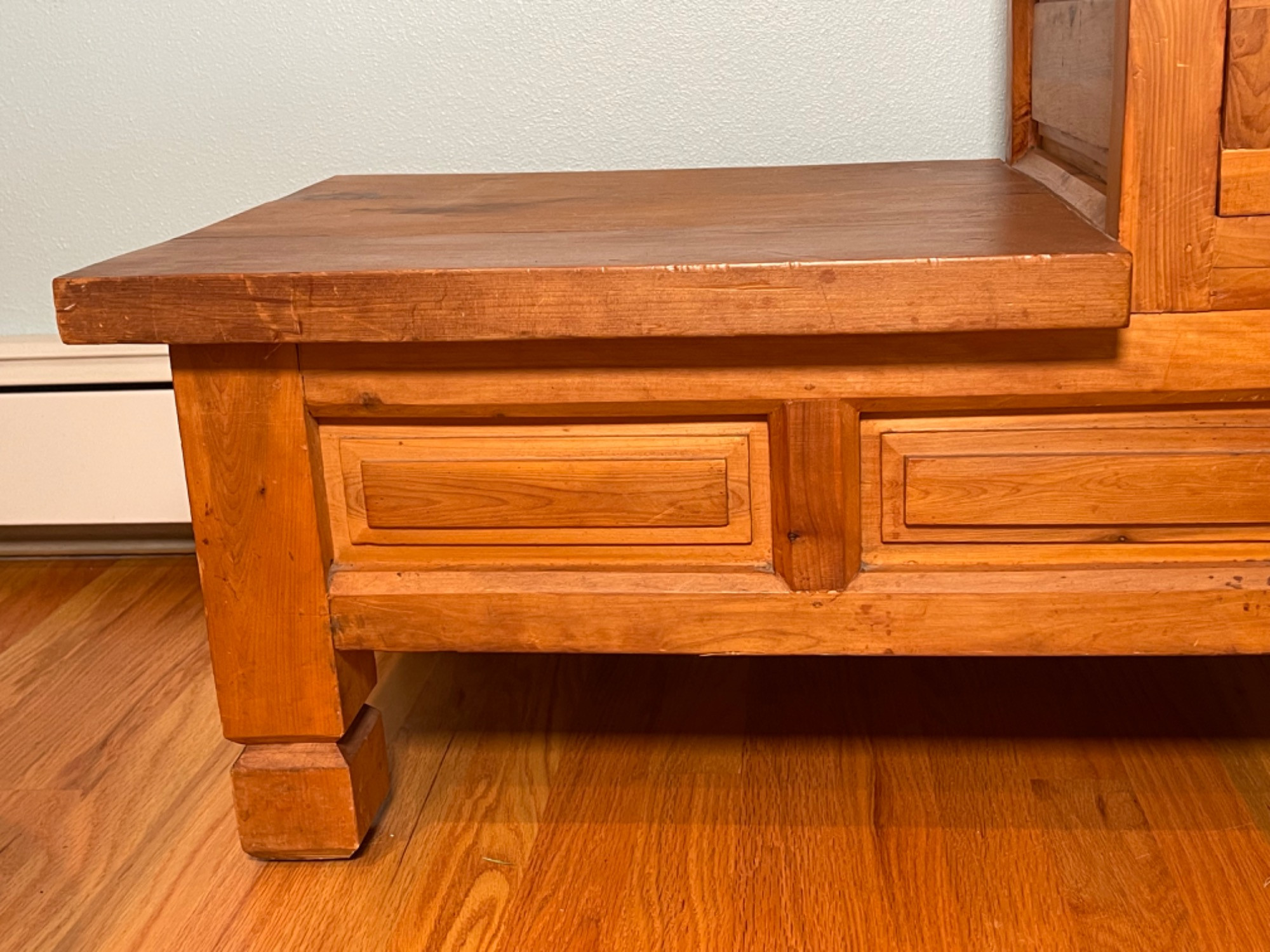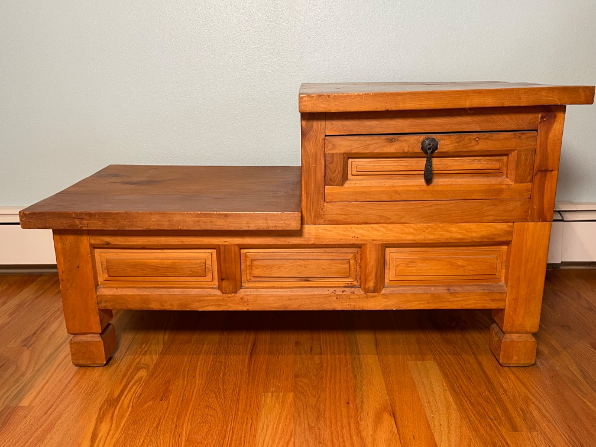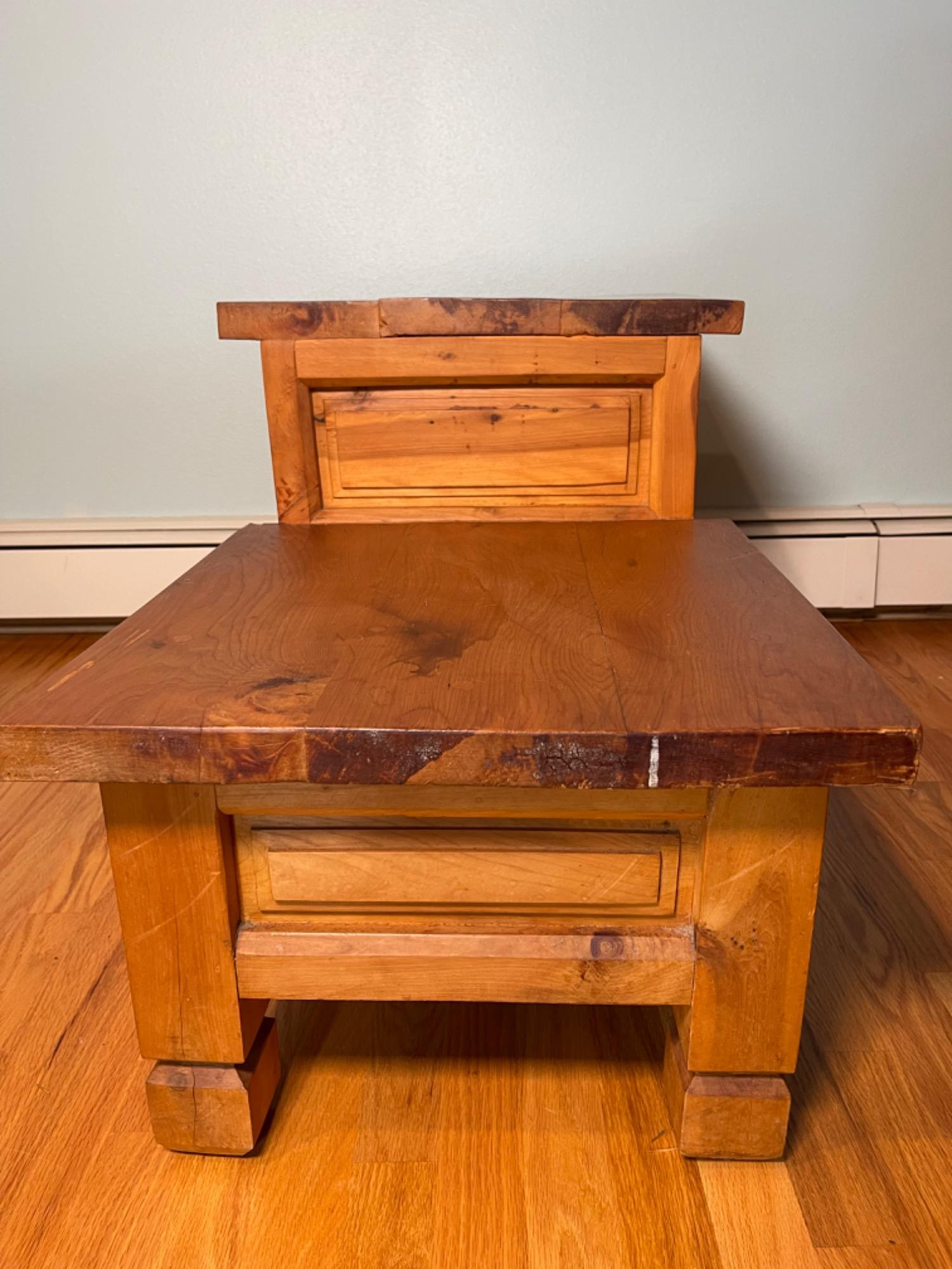 Vintage Hand Carved Solid Wood Tiered Side Table From Mexico Top appears to be a little uneven. Wood has some splitting, scratches, scuffs and stains but is in good condition.