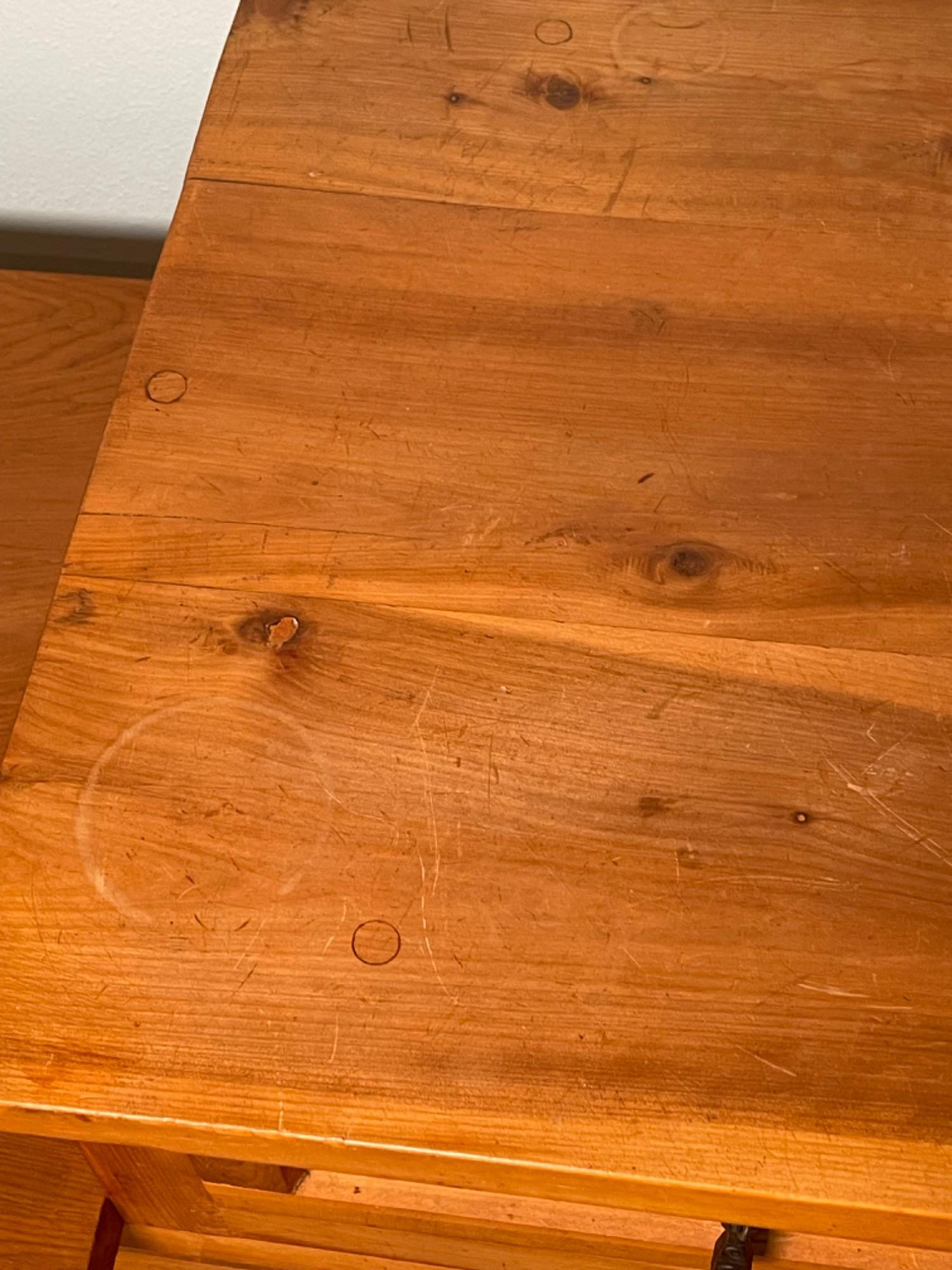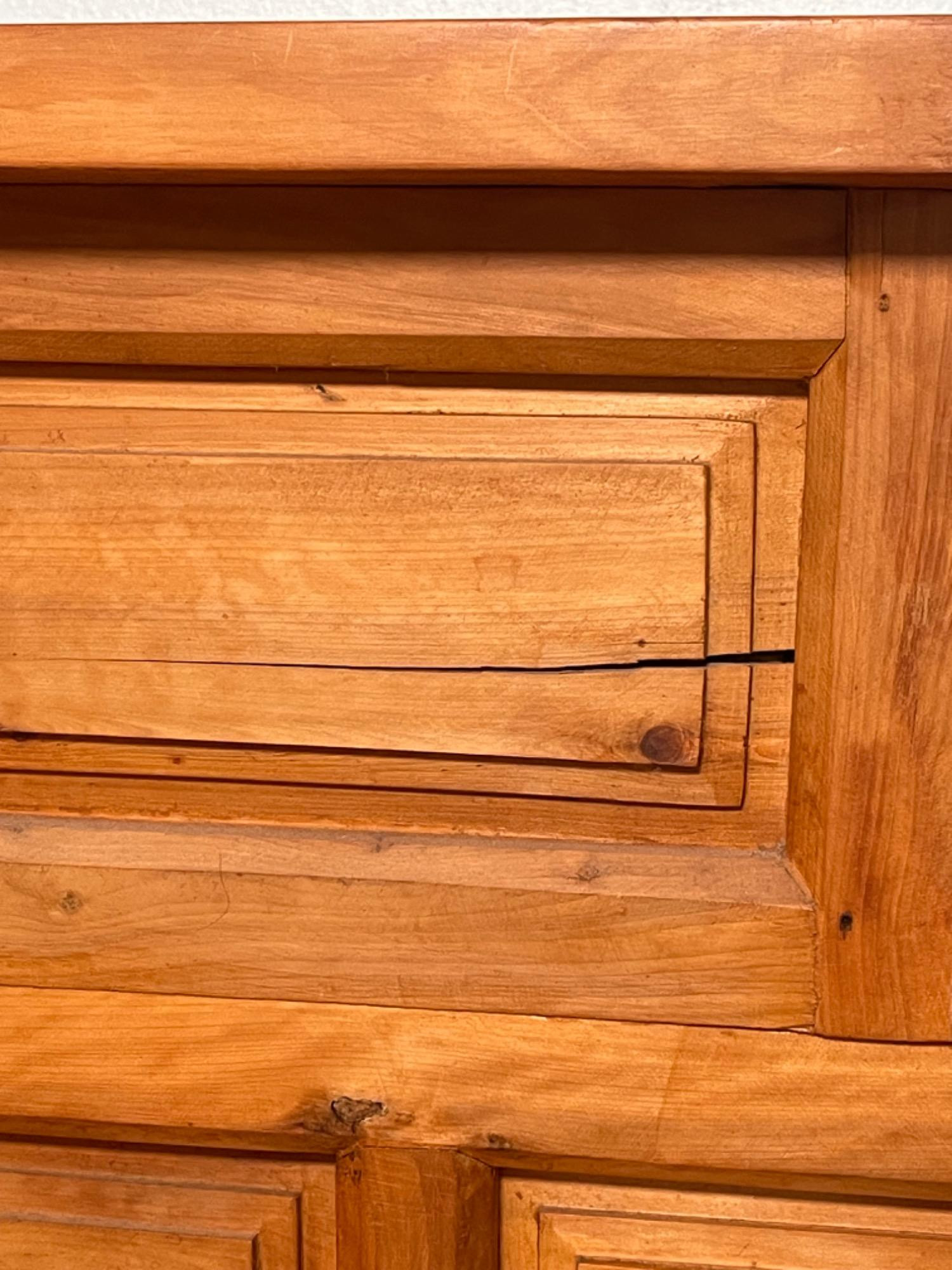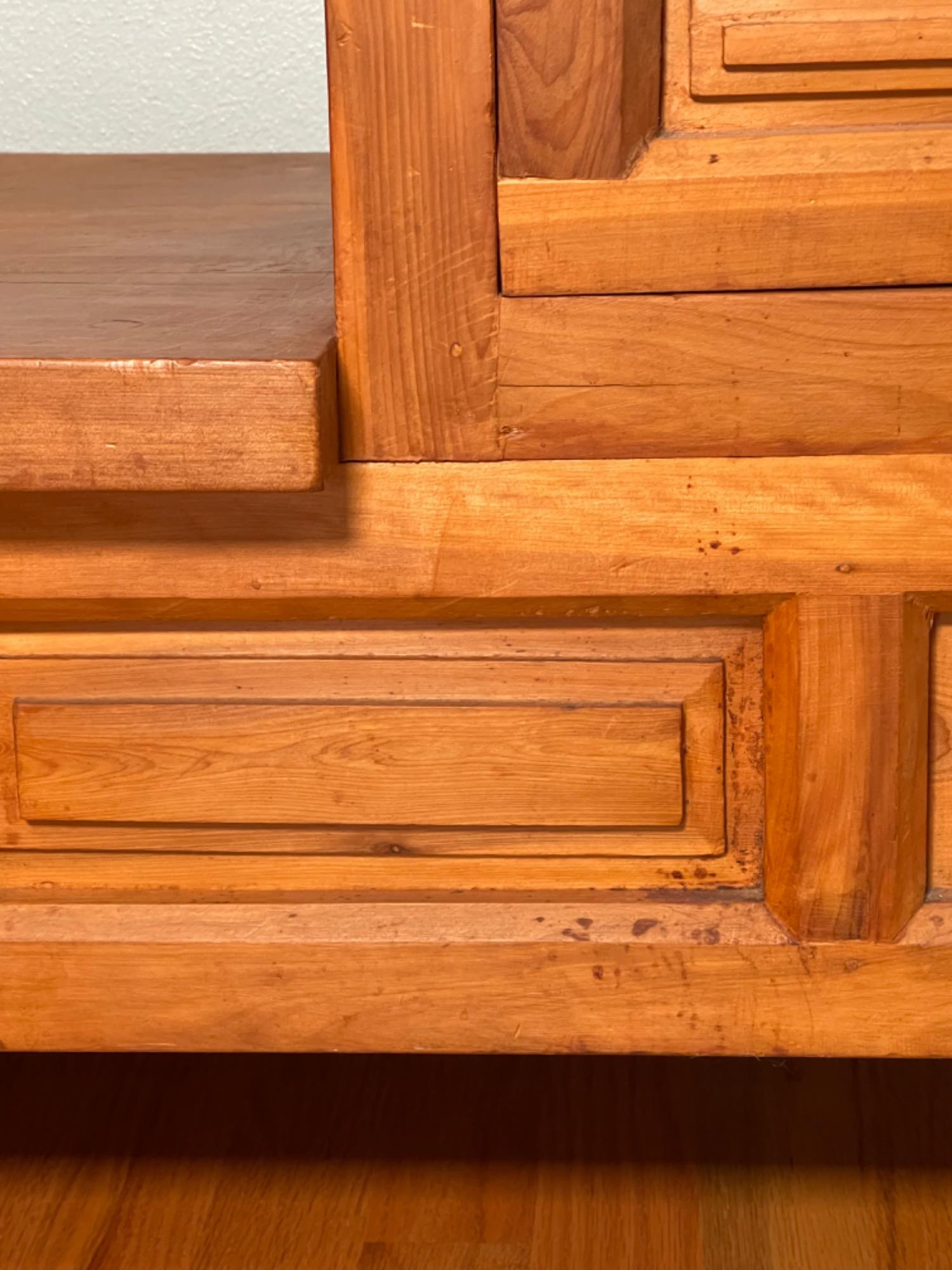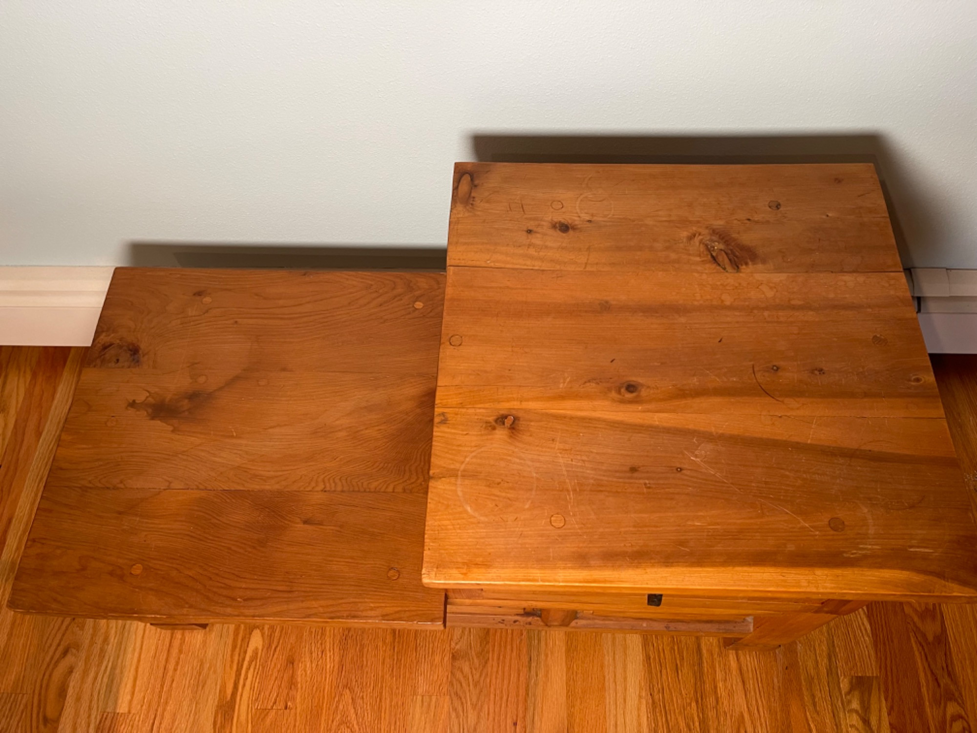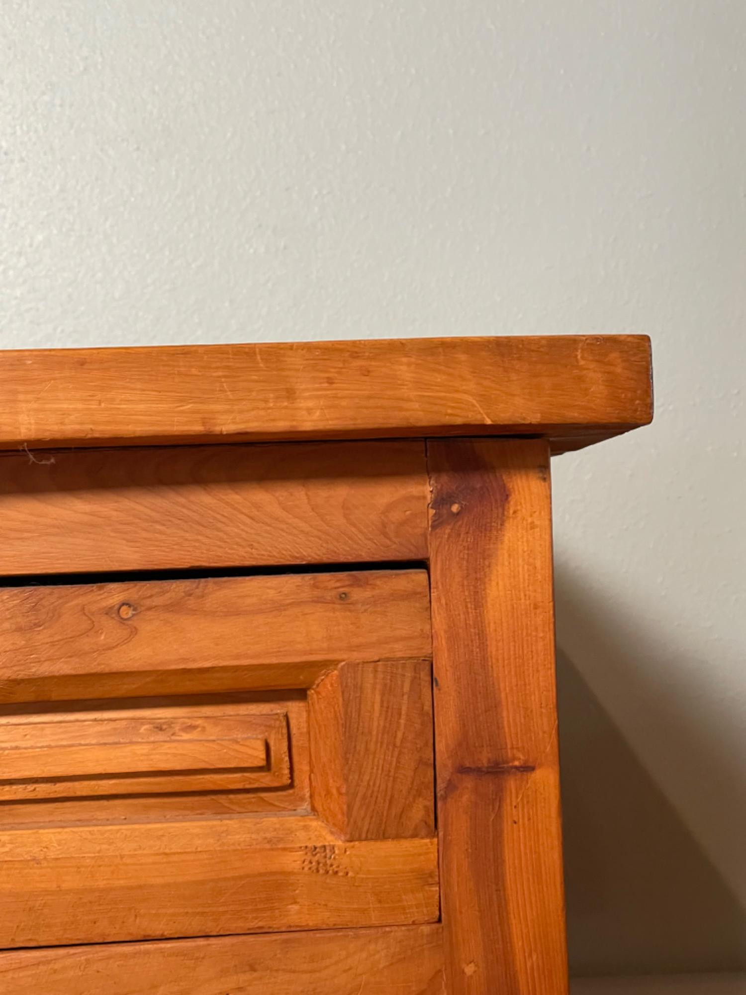 Vintage Hand Carved Solid Wood Tiered Side Table From Mexico Top appears to be a little uneven. Wood has some splitting, scratches, scuffs and stains but is in good condition.