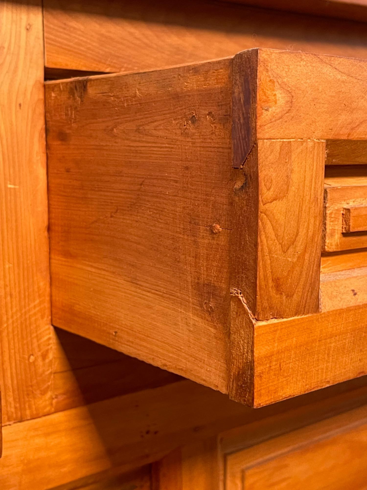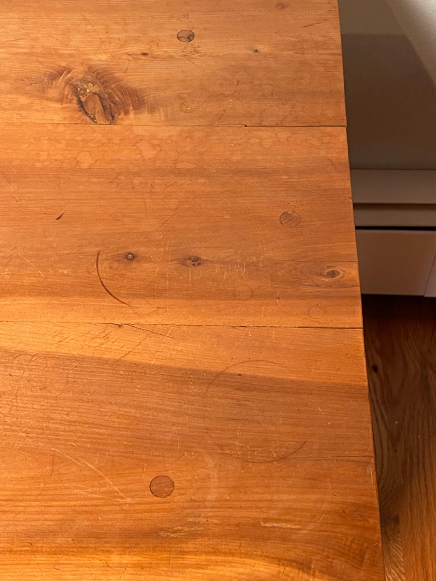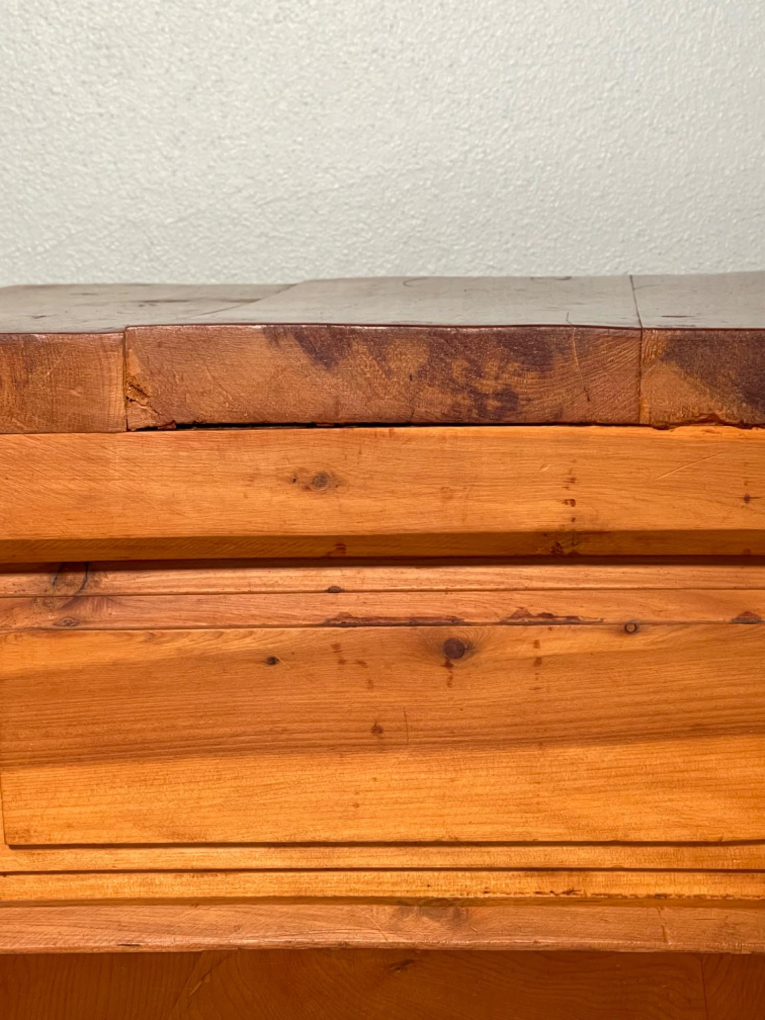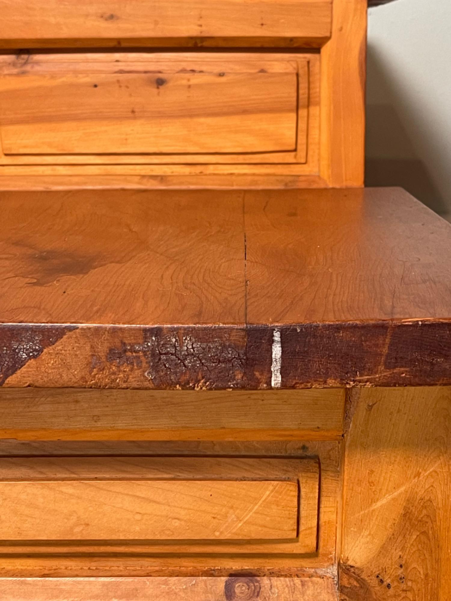 Vintage Hand Carved Solid Wood Tiered Side Table From Mexico Top appears to be a little uneven. Wood has some splitting, scratches, scuffs and stains but is in good condition.